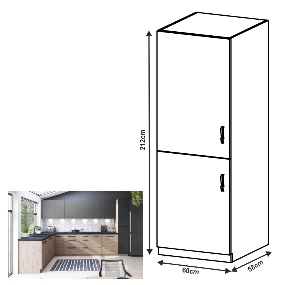 Materiál: DTD laminovaná Barva: dub artisan Rozměry (ŠxHxV): 60x58x212 cm Potravinová Tloušťka materiálu dvířka (dub artisan): 1,5 cm Tloušťka materiálu dvířka (šedá MDF): 1,8 cm S policemi Univerzální provedení Možnost volby otevírání PUSH OPEN Možnost volby otevírání úchytkami Bez spodní lišty Dodáváno v demontu Cena sektorových skříněk je uváděna bez pracovní desky a spodní lišty. Cena za pracovní desku dub artisan je 1.890 Kč / bm - tloušťka 38 mm, cena za pracovní desku černý vulkán je 2.290 Kč / bm - tloušťka 38 mm. Možnost dokoupení spodní lišty dub artisan v rozměru 1 m za cenu 280 Kč nebo v rozměru 2 m za cenu 560 Kč a ukončení na sokl o hloubce 47 cm nebo 58 cm za 140 Kč. Ke každé dolní skříňce je nutné doobjednat 2 ks úchytů na sokl cena 40 Kč / 2 ks. U skříněk D60S3 a D40S3 je třeba si vybrat skříňku s úchytkou nebo systémem Push Open.