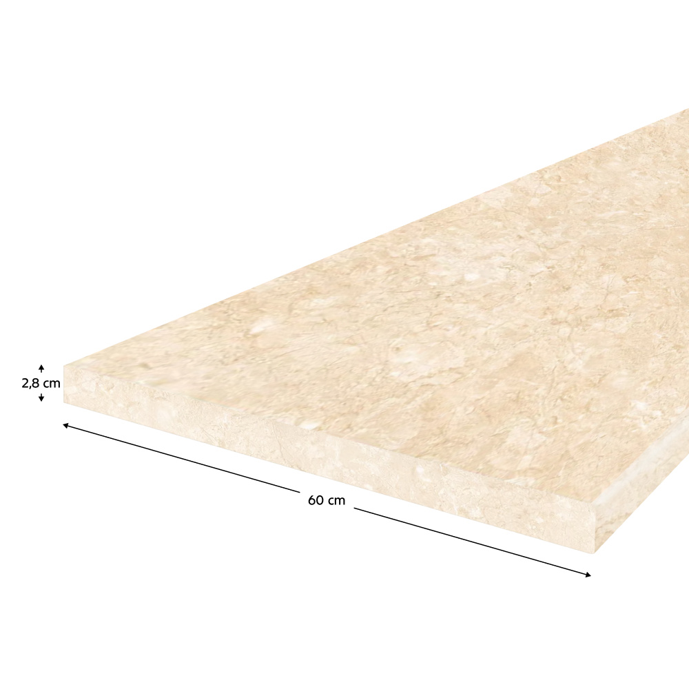 Materiál: laminovaná DTD Barva: royal beigemarble Tloušťka pracovní desky: 2,8 cm Hloubka pracovní desky: 60 cm Minimální požadovaná délka desky: 0,1 m Maximální požadovaná délka desky: 4,1 m Odolná vůči poškození Odolná vůči mechanickému opotřebení Odolná vůči světlu a vlhkosti Odolná vůči zvýšené teplotě až do 180 °C Hygienicky nezávadný povrch Vhodná pro přímý kontakt s potravinami Jednoduchá údržba Hrany jsou precizně ohraněné zažehlovací páskou Lze ji přizpůsobit na míru podle požadovaných rozměrů Kompatibilní Výroba pracovní desky na míru je závazná Platbu je třeba uhradit předem v plné výši Dodocí lhůta: 10 pracovních dnů