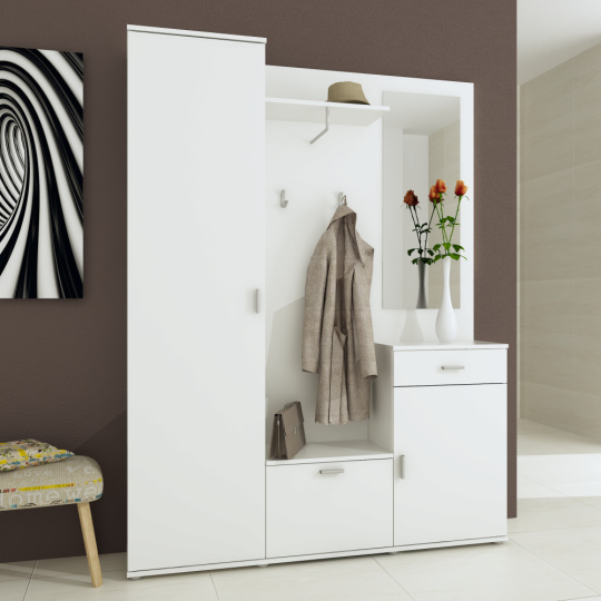 Materiál: laminovaná dřevotříska DTD Barva: bílá Rozměry (ŠxHxV): 144x29x188 cm Nosnost: 60 kg Tři skříňky, jedna se šuplíkem Jedna police věšáková stěna Zrcadlo Rozměry zrcadla (ŠxV): 47,9x90 cm Šířka a výška věšákové skříně: 47,2x188 cm Šířka a výška střední skříňky: 48,2x32,7 cm Šířka a výška skříňky na pravé straně: 47,8x62,5 cm Výška šuplíku: 15 cm Šířka a hloubka police: 48,1x24 cm Tloušťka materiálu korpus: 16 mm Kvalitní slovenský výrobek Dodáváno v demontu