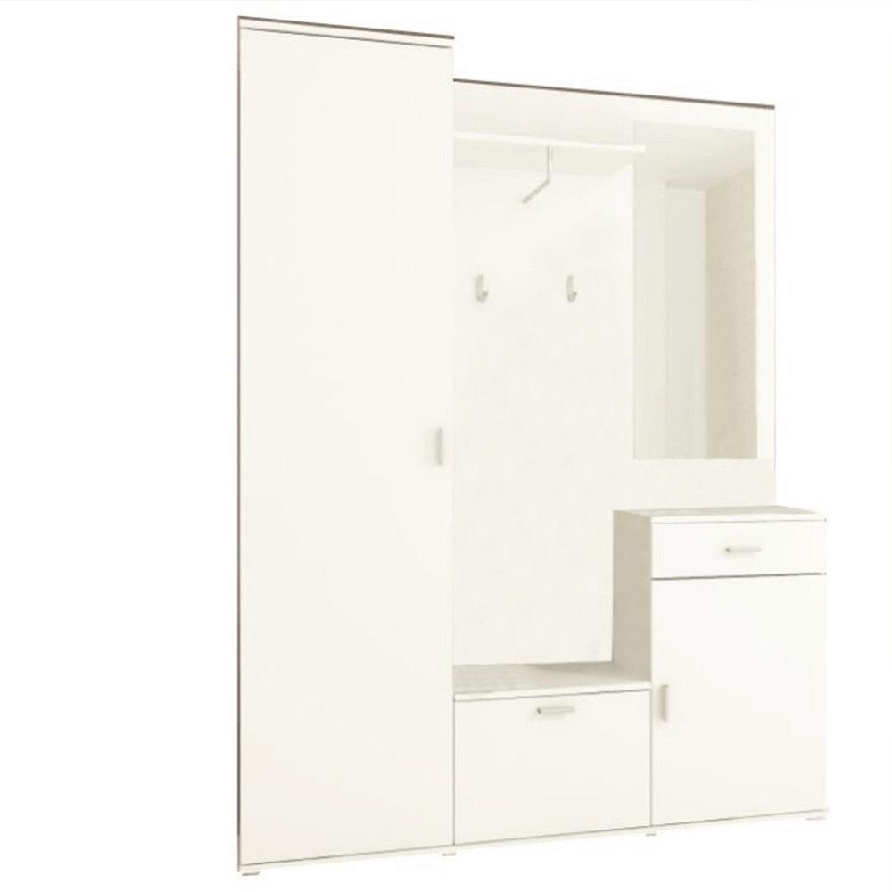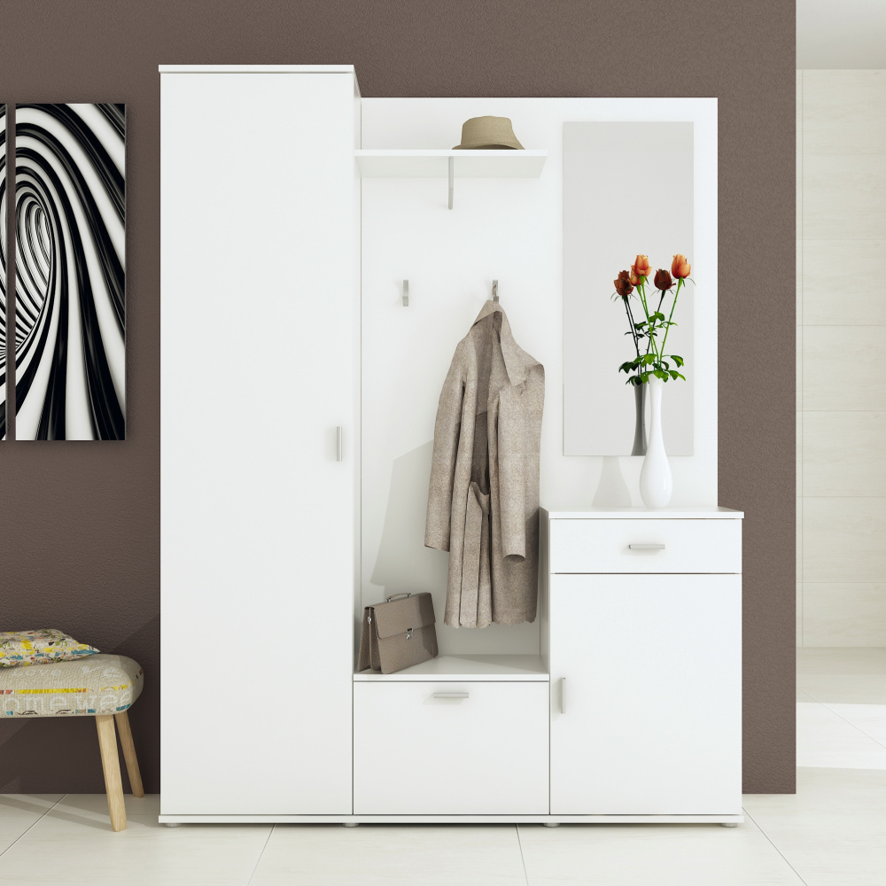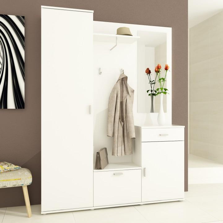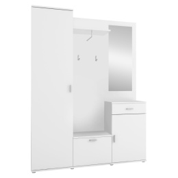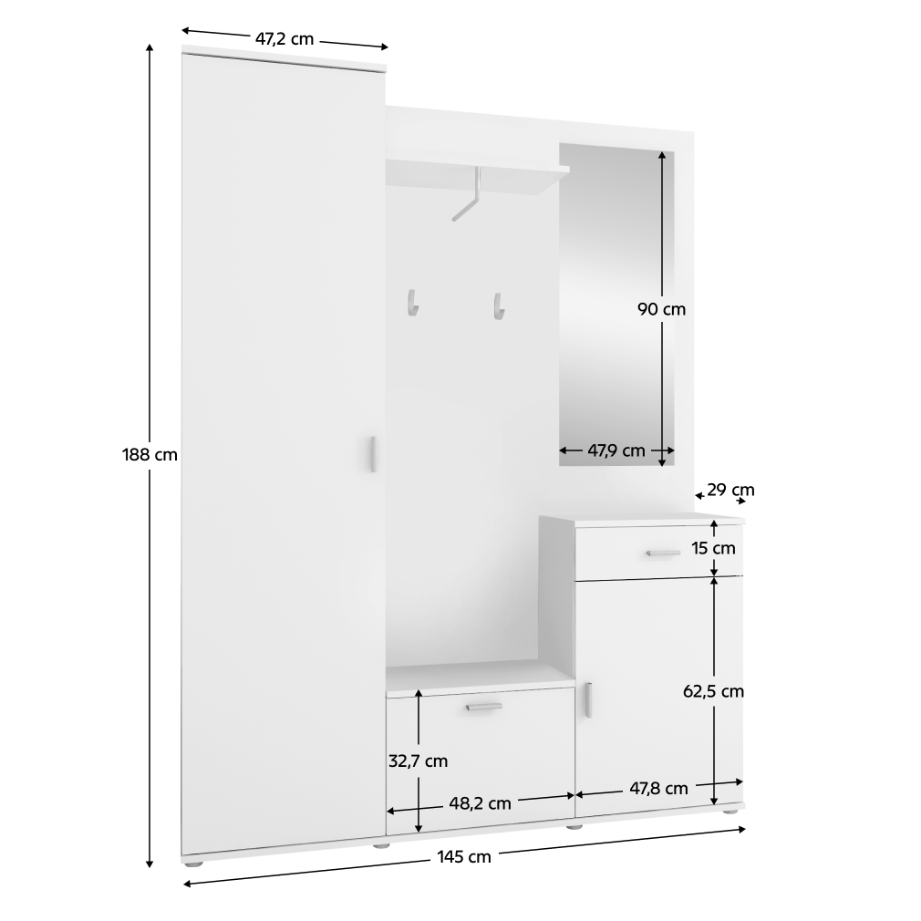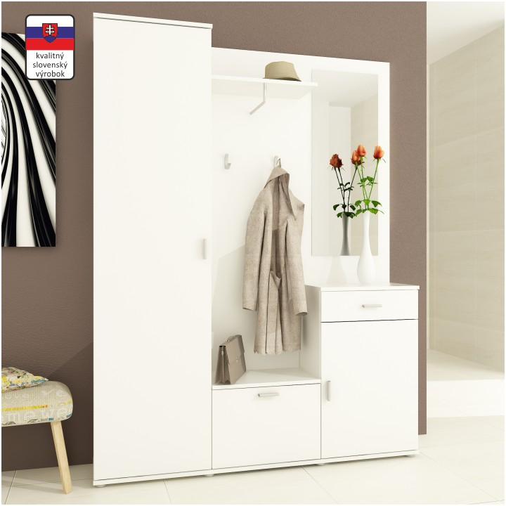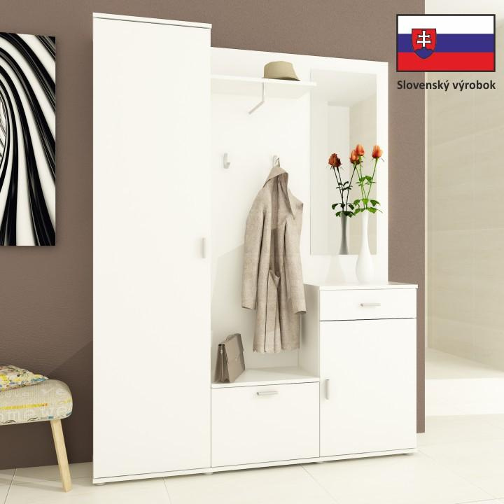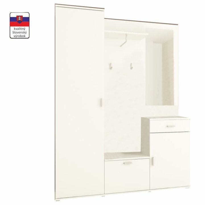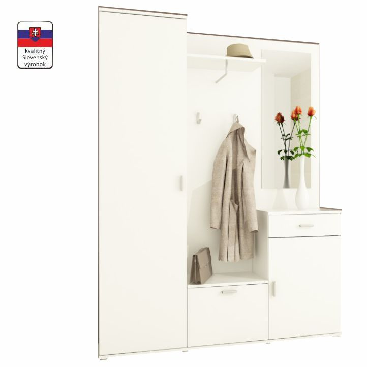 Materiál: laminovaná dřevotříska DTD Barva: bílá Rozměry (ŠxHxV): 144x29x188 cm Nosnost: 60 kg Tři skříňky, jedna se šuplíkem Jedna police věšáková stěna Zrcadlo Rozměry zrcadla (ŠxV): 47,9x90 cm Šířka a výška věšákové skříně: 47,2x188 cm Šířka a výška střední skříňky: 48,2x32,7 cm Šířka a výška skříňky na pravé straně: 47,8x62,5 cm Výška šuplíku: 15 cm Šířka a hloubka police: 48,1x24 cm Tloušťka materiálu korpus: 16 mm Kvalitní slovenský výrobek Dodáváno v demontu