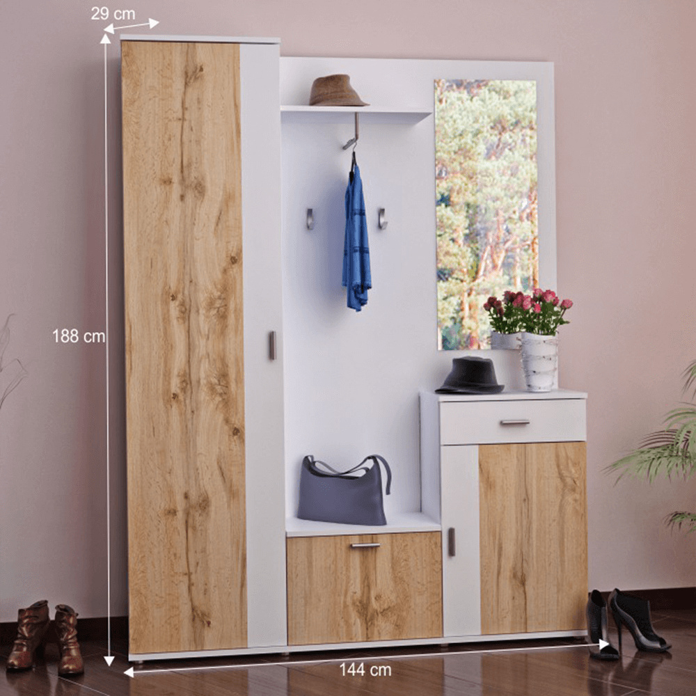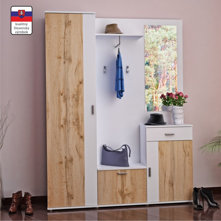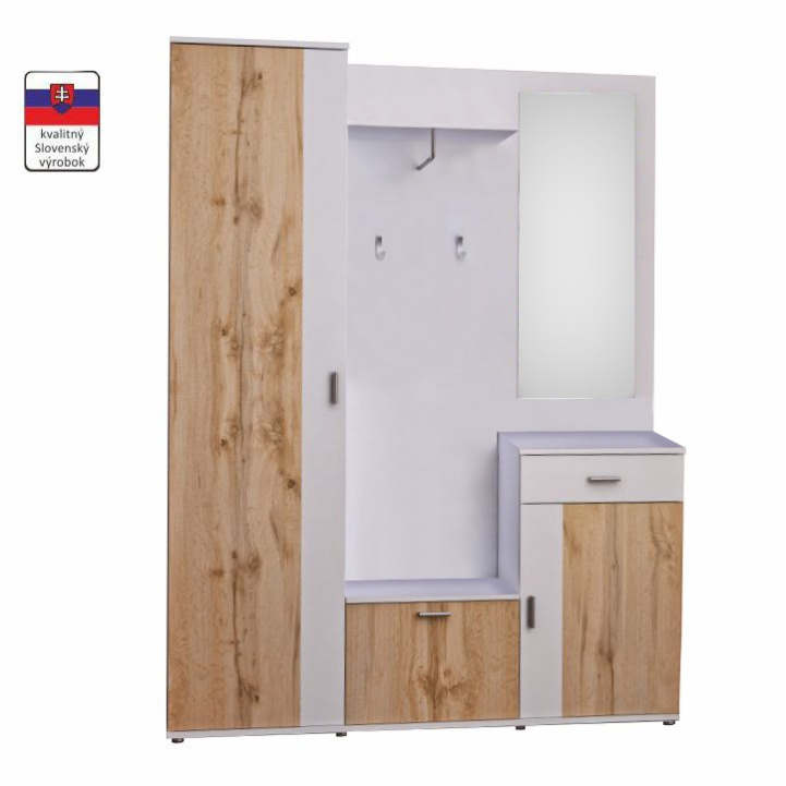 Predsieňová zostava AMALIA Materiál: DTD laminovaná Farební provedení: bílá / dub wotan Rozmery (ŠxHxV): 144x29x188 cm Tloušťka materiálu korpus: 16 mm