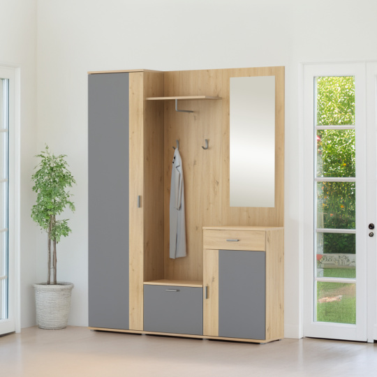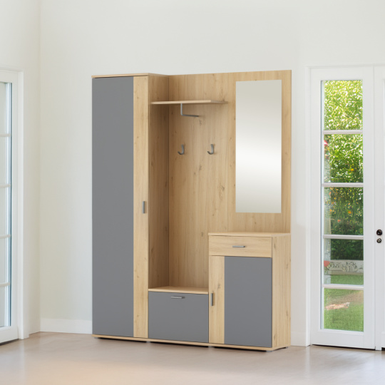 Materiál: laminovaná dřevotříska DTD Barva: dub artisan/grafit Rozměry (ŠxHxV): 144x29x188 cm Nosnost: 60 kg Tři skříňky, jedna se šuplíkem Jedna police věšáková stěna Zrcadlo Rozměry zrcadla (ŠxV): 47,9x90 cm Šířka a výška věšákové skříně: 47,2x188 cm Šířka a výška střední skříňky: 48,2x32,7 cm Šířka a výška skříňky na pravé straně: 47,8x62,5 cm Výška šuplíku: 15 cm Šířka a hloubka police: 48,1x24 cm Tloušťka materiálu korpus: 16 mm Kvalitní slovenský výrobek Dodáváno v demontu