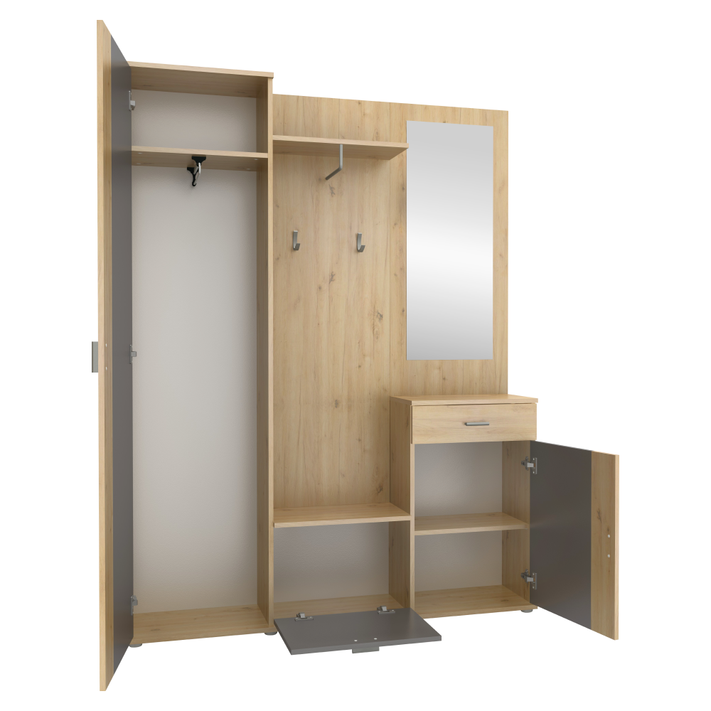 Materiál: laminovaná dřevotříska DTD Barva: dub artisan/grafit Rozměry (ŠxHxV): 144x29x188 cm Nosnost: 60 kg Tři skříňky, jedna se šuplíkem Jedna police věšáková stěna Zrcadlo Rozměry zrcadla (ŠxV): 47,9x90 cm Šířka a výška věšákové skříně: 47,2x188 cm Šířka a výška střední skříňky: 48,2x32,7 cm Šířka a výška skříňky na pravé straně: 47,8x62,5 cm Výška šuplíku: 15 cm Šířka a hloubka police: 48,1x24 cm Tloušťka materiálu korpus: 16 mm Kvalitní slovenský výrobek Dodáváno v demontu