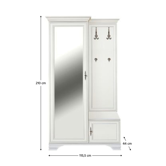 Materiál: DTD laminovaná Barva: alpská bílá Rozměry (ŠxHxV): 115,5x44x210 cm Tloušťka materiálu: 1,6 cm Kovové úchytky Barva úchytek: antické stříbro Úložný prostor Zrcadlo Skříňka s policí Nosnost police: 4 kg věšáková část Kovové háčky Barva háčků: antické stříbro Nosnost háčku: 5 kg Na nožičkách Výška nožiček: 8 cm Levé provedení Doporučujeme připevnit ke stěně Dodáváno v demontu