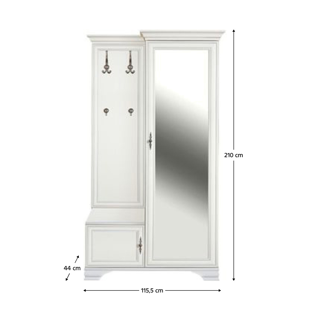 Materiál: DTD laminovaná Barva: alpská bílá Rozměry (ŠxHxV): 115,5x44x210 cm Tloušťka materiálu: 1,6 cm Kovové úchytky Barva úchytek: antické stříbro Úložný prostor Zrcadlo Skříňka s policí Nosnost police: 4 kg Věšáková část Kovové háčky Barva háčíků: antické stříbro Nosnost háčků: 5 kg Na nožičkách Výška nožiček: 8 cm Pravé provedení Doporučujeme připevnit ke zdi Dodáváno v demontu