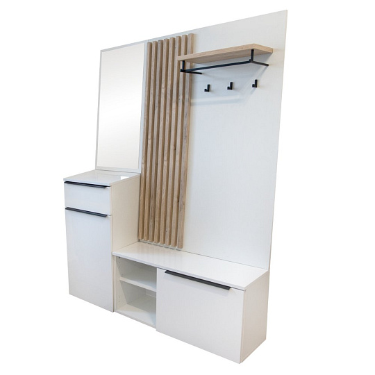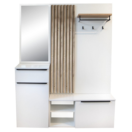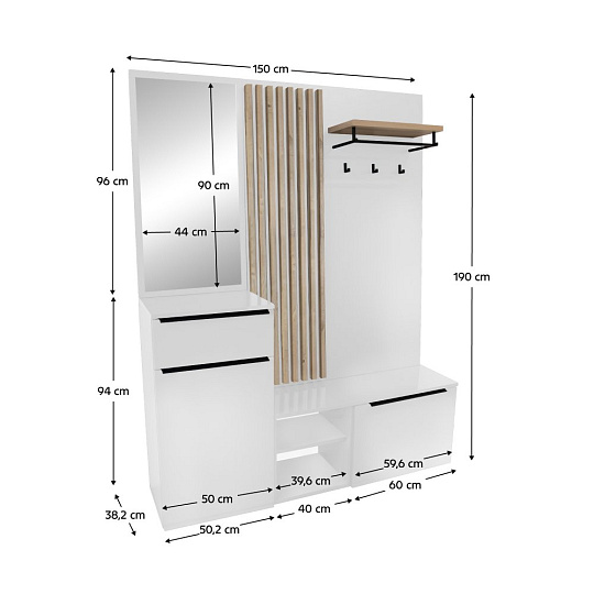 Materiál: laminovaná DTD Barva: bílá extra vysoký lesk HG/dub artisan Rozměry (ŠxHxV): 150x38,2x190 cm Tloušťka materiálu: 1,8 cm Se zrcadlem Rozměry zrcadla (ŠxV): 44x90 cm Otevřený úložný prostor Skříňka s policemi Nosnost police: 3 kg Šuplík Nosnost šuplíku: 3 kg 1x výklopný botník Možnost sezení na botníku Nosnost vrchní desky botníku: Max. 50 kg Dodáváno bez polštáře Věšáková tyč Nosnost věšákové tyče: 4 kg 3 černé háčky Nosnost háčku: 2 kg Se zrcadlem Rozměry zrcadla (ŠxV): 35x87,9 cm Černé kovové úchytky Na nožičkách Materiál nožiček: kov Barva nožiček: černá Výška nožiček: 3 cm Dodáváno s ozdobnými lamelami Úložný prostor Moderní design Doporučujeme připevnit ke zdi Dodáváno v demontu