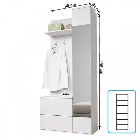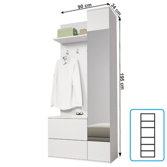 Materiál: laminovaná DTD Barva: bílá Rozměry (ŠxHxV): 90x34x195 cm S výklopným botníkem se zrcadlem S policovou skříní věšákový panel Otevírání PUSH - UP ABS hrany věšáková část Dodávané v demontu