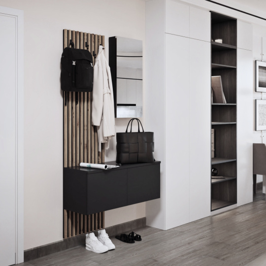Materiál: laminovaná DTD/sklo Barva: černá/dub artisan Rozměry (ŠxHxV): 100x37,1x195,5 cm Tloušťka materiálu: 1,6 cm Tloušťka lamely: 2,2 cm Panel Botníková skříňka Zrcadlová skříňka Univerzální Policová Zrcadlo 5 háčků Materiál háčku: plast Barva háčku: černá Nosnost police zrcadlová skříňka: 5 kg Nosnost police botníková skříňka: 7 kg Dvířka se otevírají mechanismem push up Doporučujeme připevnit ke stěně Dodáváno v demontu
