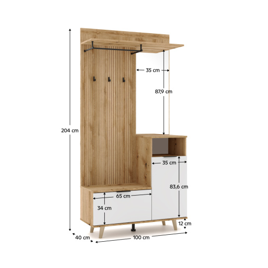 Materiál: DTD/ABS hrany Barva: dub evoke/bílá Rozměry (ŠxHxV): 100x40x204 cm Tloušťka materiálu: 1,6 cm Otevřený úložný prostor Skříňka s policemi Nosnost police: 5 kg Výklopný botník Nosnost vrchní desky botníku: 10 kg Věšáková část Nosnost věšákové tyče: 1 kg 3 háčky Nosnost háčku: 1 kg Se zrcadlem Dekorační 3D lamelový panel S úchytkami Na nožičkách Materiál nožiček: dřevo Středová podpůrná nožička Materiál podpůrné nožičky: plast Výška spodního prostoru od podlahy: 12 cm Doporučujeme připevnit ke zdi Dodáváno v demontu