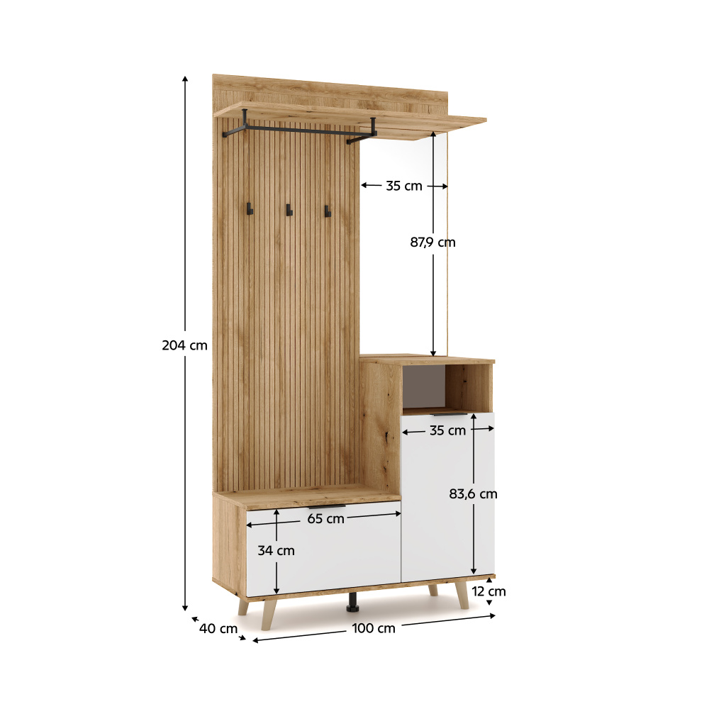 Materiál: DTD/ABS hrany Barva: dub evoke/bílá Rozměry (ŠxHxV): 100x40x204 cm Tloušťka materiálu: 1,6 cm Otevřený úložný prostor Skříňka s policemi Nosnost police: 5 kg Výklopný botník Nosnost vrchní desky botníku: 10 kg Věšáková část Nosnost věšákové tyče: 1 kg 3 háčky Nosnost háčku: 1 kg Se zrcadlem Dekorační 3D lamelový panel S úchytkami Na nožičkách Materiál nožiček: dřevo Středová podpůrná nožička Materiál podpůrné nožičky: plast Výška spodního prostoru od podlahy: 12 cm Doporučujeme připevnit ke zdi Dodáváno v demontu