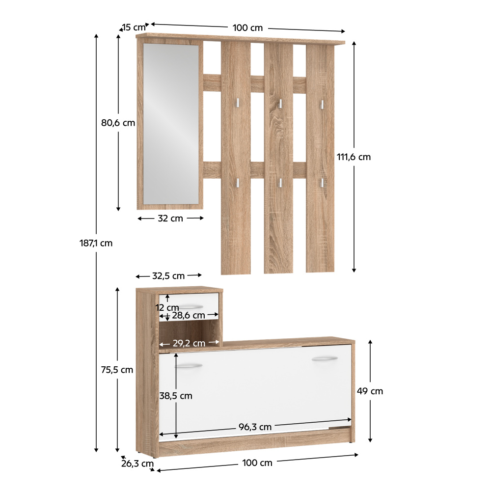 Materiál: laminovaná DTD Barva: dub sonoma/bílá Rozměry (ŠxHxV): 100x26,3x187,1 cm Tloušťka materiálu: 1,6 cm Výklopný botník Nosnost police: 5 kg Nosnost vrchní deska: 15 kg Otevřený úložný prostor Zásuvka Nosnost zásuvky: 3 kg Nosnost vrchní deska: 15 kg Zrcadlo Rozměry zrcadla (ŠxV): 32x80,6 cm S háčky Materiál háčků: plast Barva háčku: stříbrná Nosnost háčku: 2 kg S úchytkami Materiál úchytek: plast Barva úchytek: stříbrná Moderní design Doporučujeme připevnit ke zdi Základní sestava je bez skříně Dodáváno v demontu