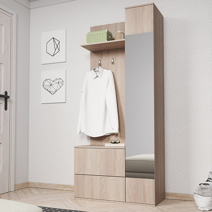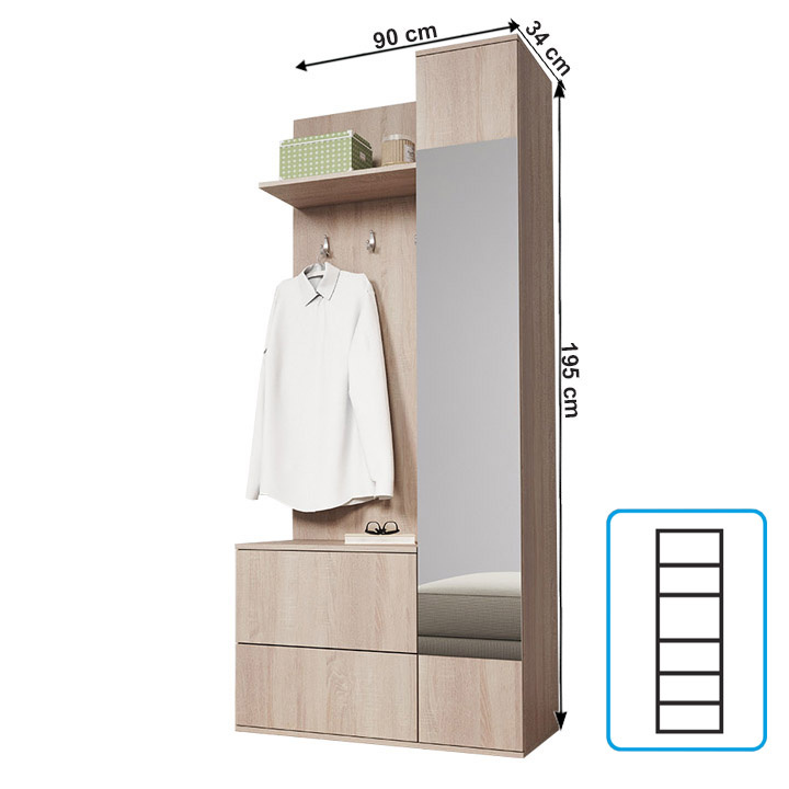 Materiál: laminovaná DTD Barva: dub sonoma Rozměry (ŠxHxV): 90x34x195 cm S výklopným botníkem se zrcadlem S policovou skříní věšákový panel Otevírání PUSH - UP ABS hrany věšáková část Dodávané v demontu