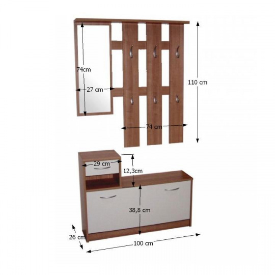 Elegantní předsíňová sestava, materiál: DTD laminovaná Provedení: wenge / bílá Rozměry: ŠxHxV: věšáková sestava 100x26x190cm. Tloušťka materiálu: 16 mm Plastové úchytky Dodávané v demontu.