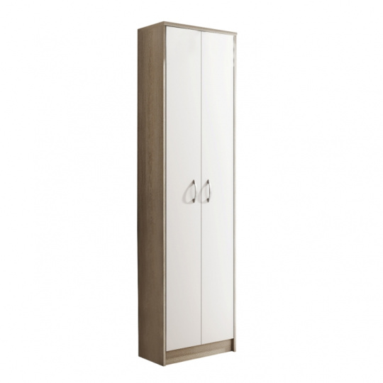 Předsíňová skříň VIRA-Meckel Materiál: laminovaná DTD Barva: dub sonoma/bílá Rozměry (ŠxHxV): 55x26x190 cm Tloušťka materiálu: 16 mm Čtyř policová Dvoudveřová Plastové úchytky Dodáváno v demontu