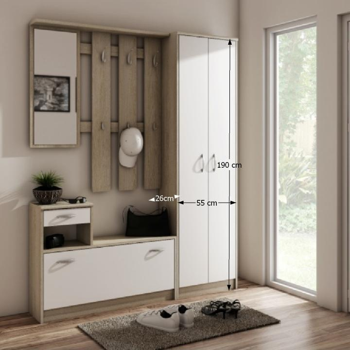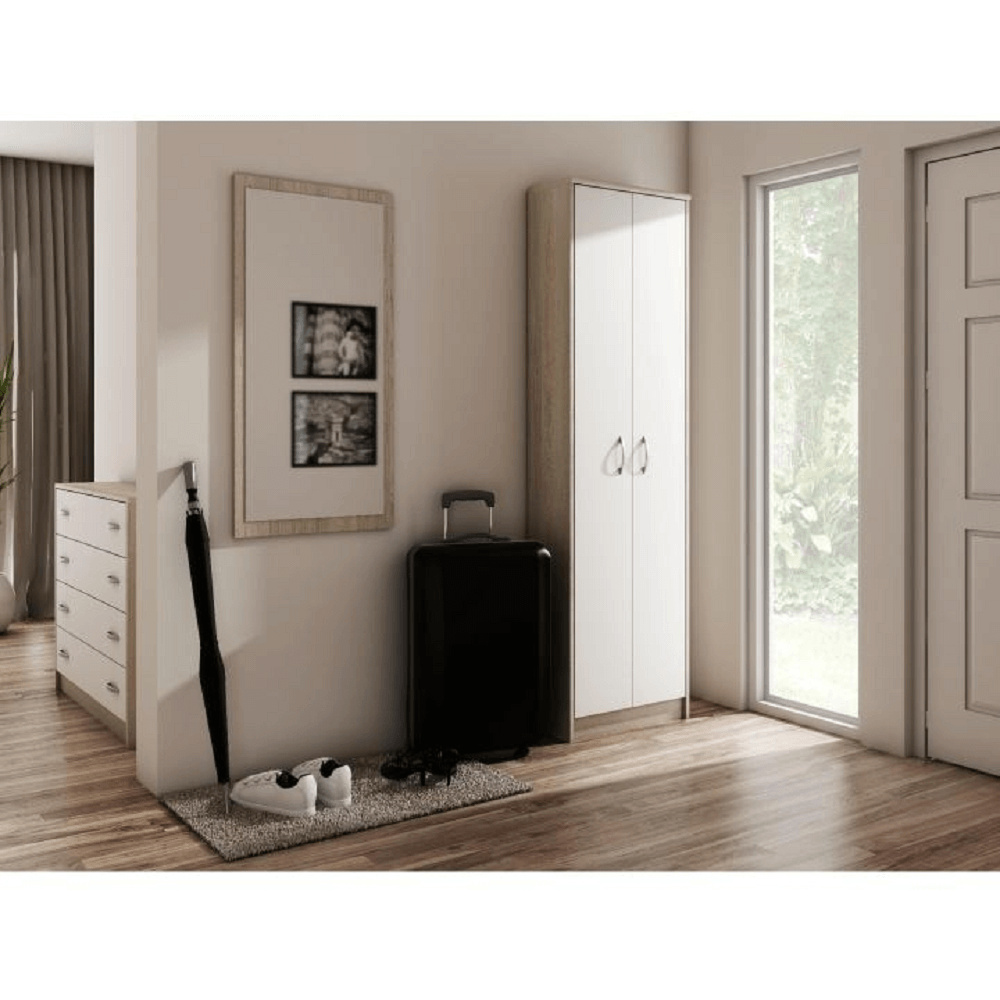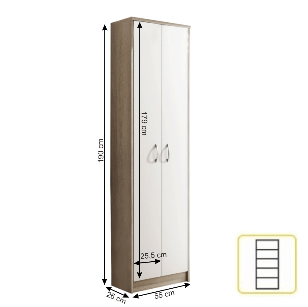 Předsíňová skříň VIRA-Meckel Materiál: laminovaná DTD Barva: dub sonoma/bílá Rozměry (ŠxHxV): 55x26x190 cm Tloušťka materiálu: 16 mm Čtyř policová Dvoudveřová Plastové úchytky Dodáváno v demontu