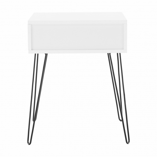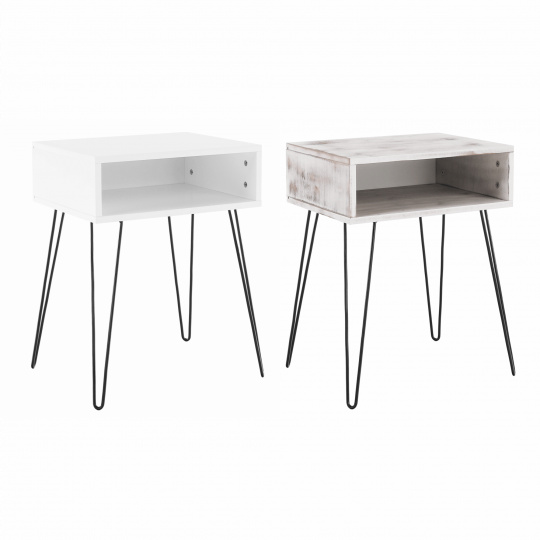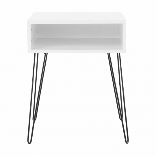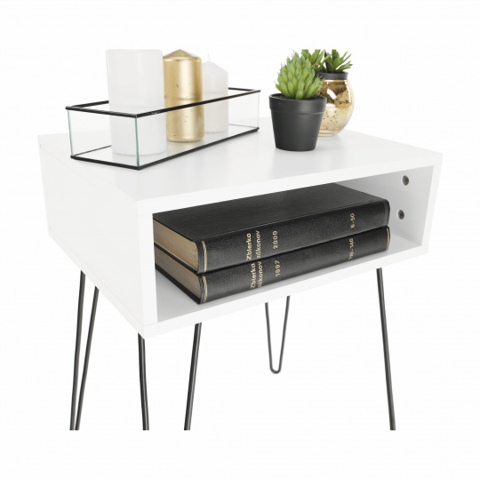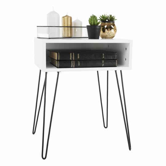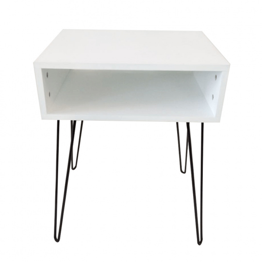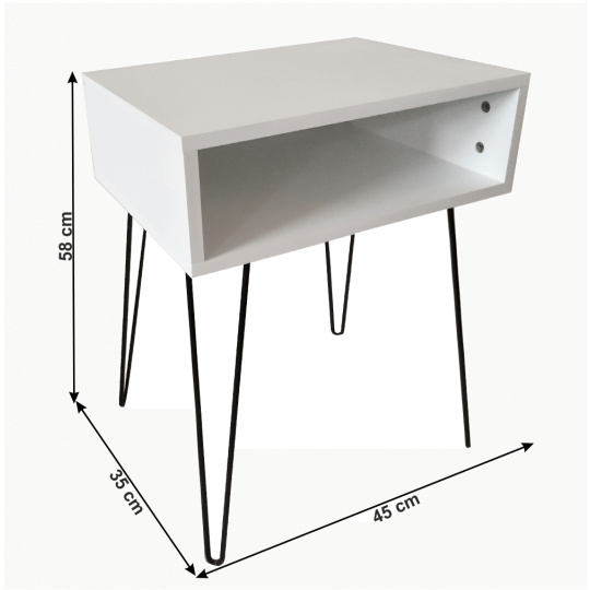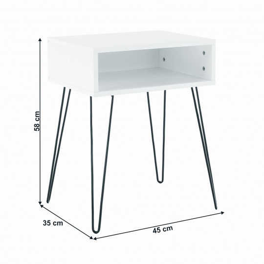 Materiál: MDF stříkaný mat / kov Barva: bílá / černá Rozměry (ŠxHxV): 45x35x58 cm Otevřený úložný prostor příruční stolek noční stolek Dodávané v demontu