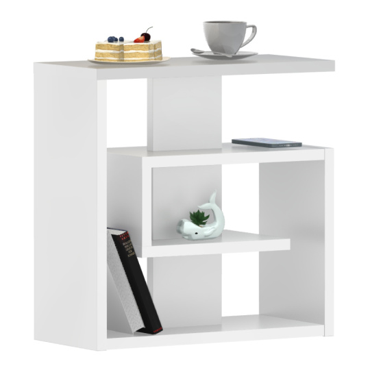 Materiál: laminovaná DTD Barva: bílá Rozměry (ŠxHxV): 55x25x55 cm Tloušťka materiálu: 2,2 cm Police Výška mezi policemi: 15,4 cm Otevřený úložný prostor Příruční stolek Samolepící pěnové kluzáky Nosnost: 5 kg Hmotnost: 13 kg Moderní design Kvalitní slovenský výrobek Dodáváno v demontu