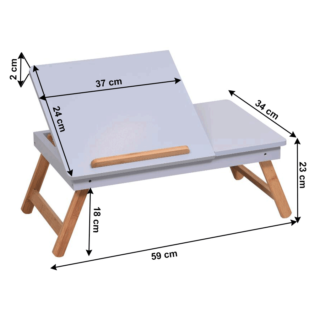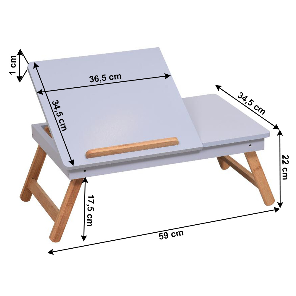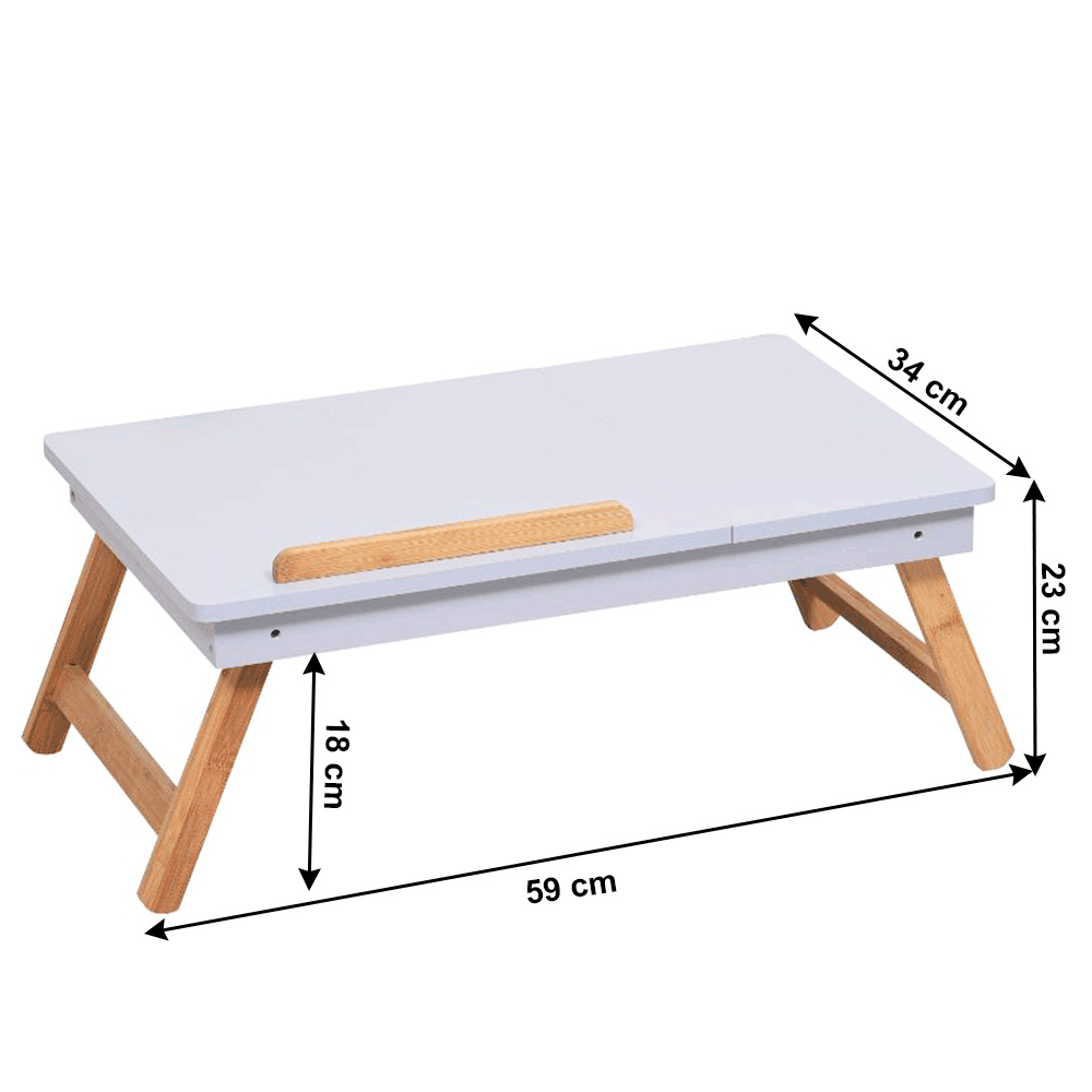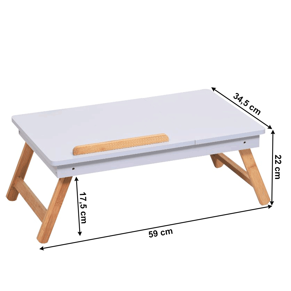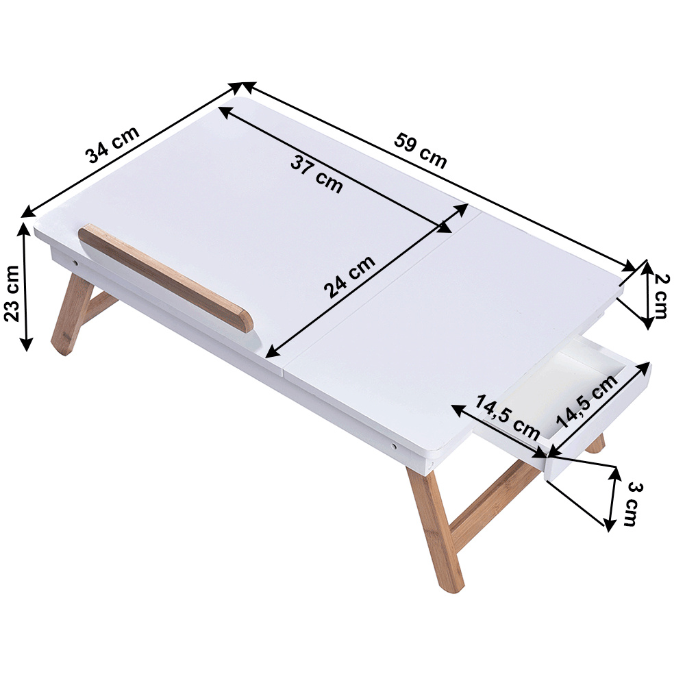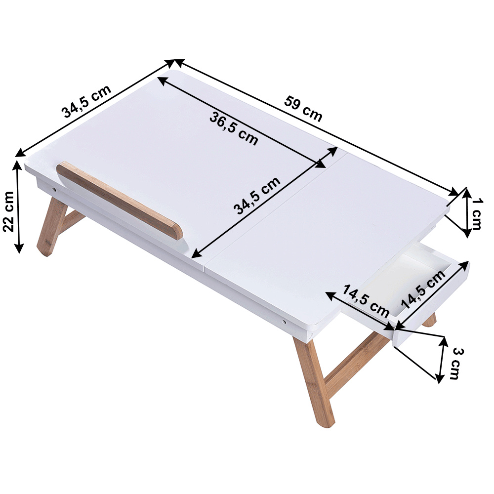 Materiál: MDF/bambus Barva: bílá/přírodní bambus Rozměry (ŠxHxV): 59x34,5x22 cm Výška prostoru od země po polici: 17,5 cm Rozměry přihrádky: 14,5x14,5x3 cm Rozměry vyklápěcí části (ŠxH): 36,5x34,5 cm Tloušťka vyklápěcí desky: 1 cm Nosnost: Max. 10 kg Hmotnost: 3 kg Inovativní a funkční design Stolek na notebook, boční stůl Držák na tablet Vhodný jako podnos Vytahovací přihrádka na drobnosti Možnost nastavení sklonu: 3 polohy Všestranný Sklápěcí nohy Jednoduchá manipulace a přenos Dodáváno v demontu.