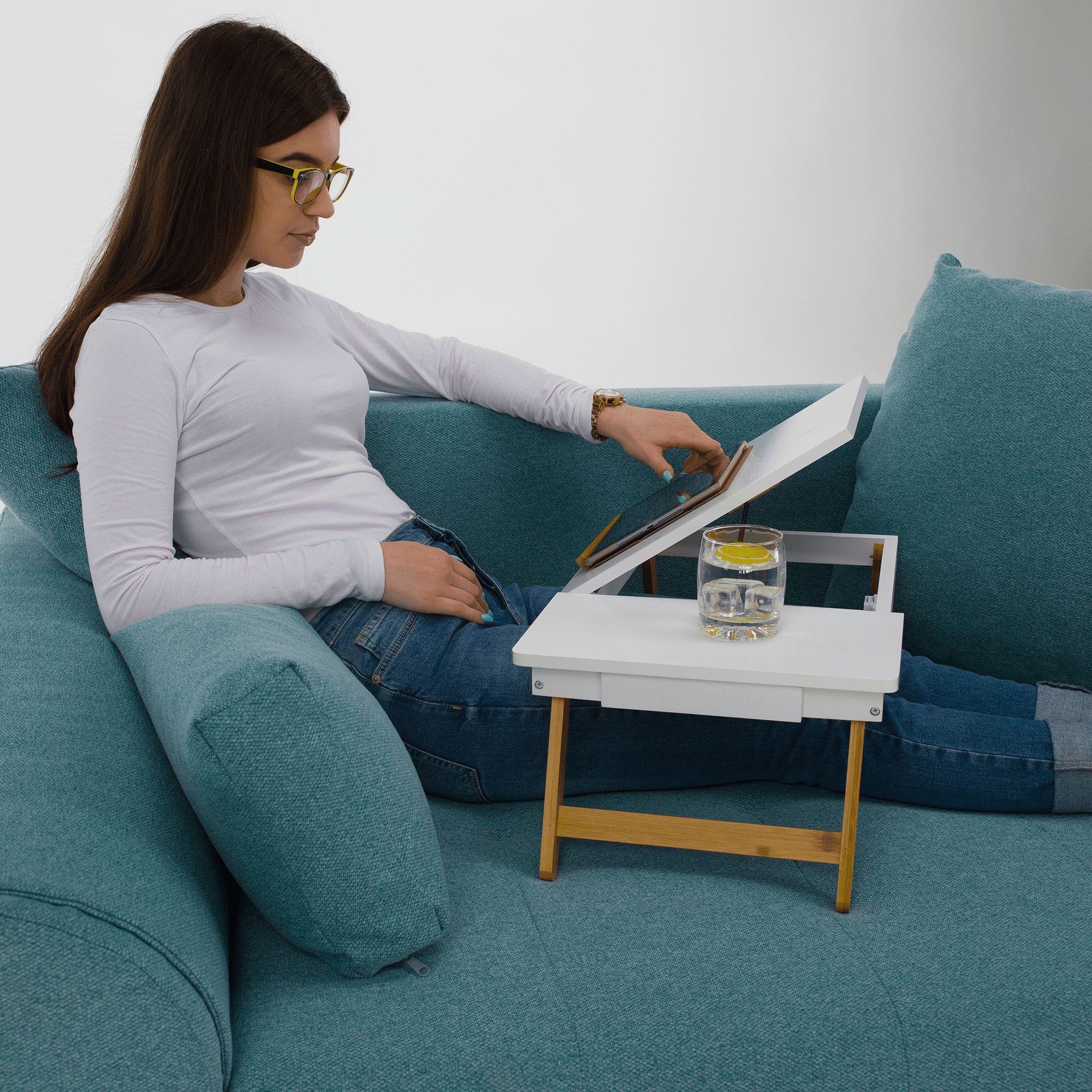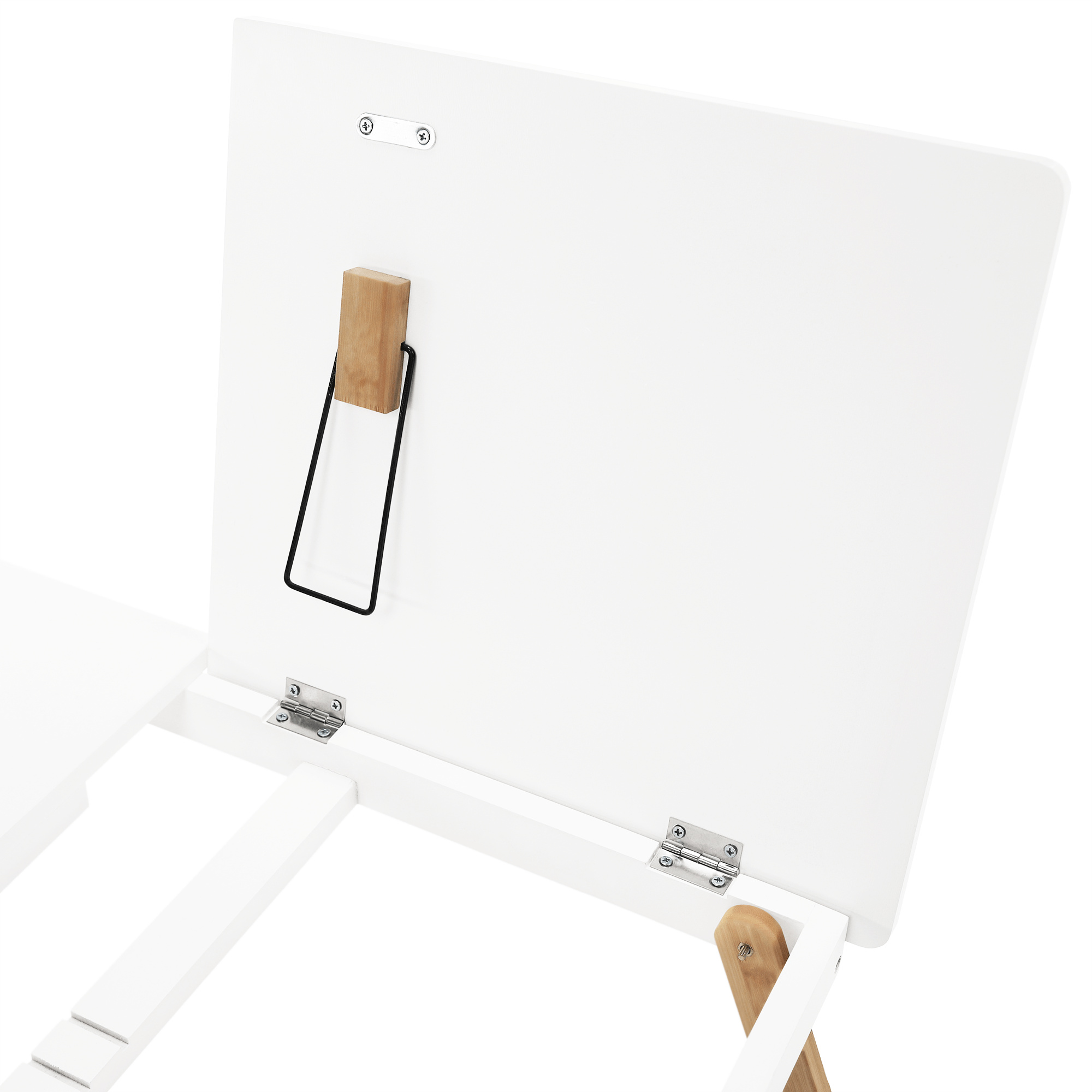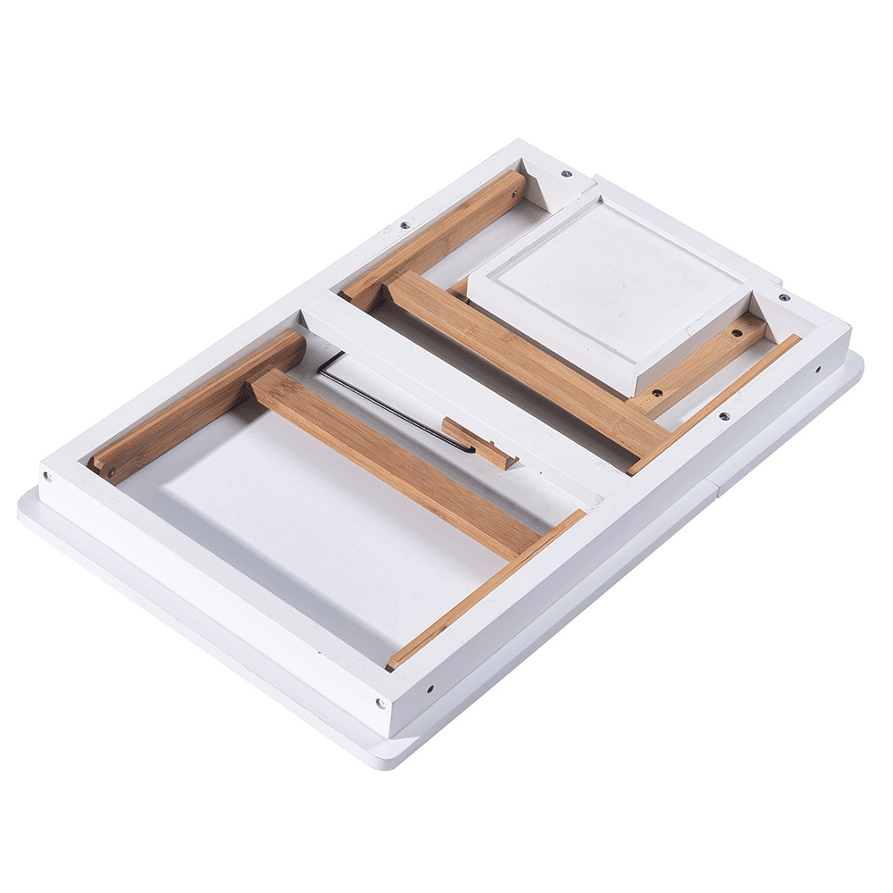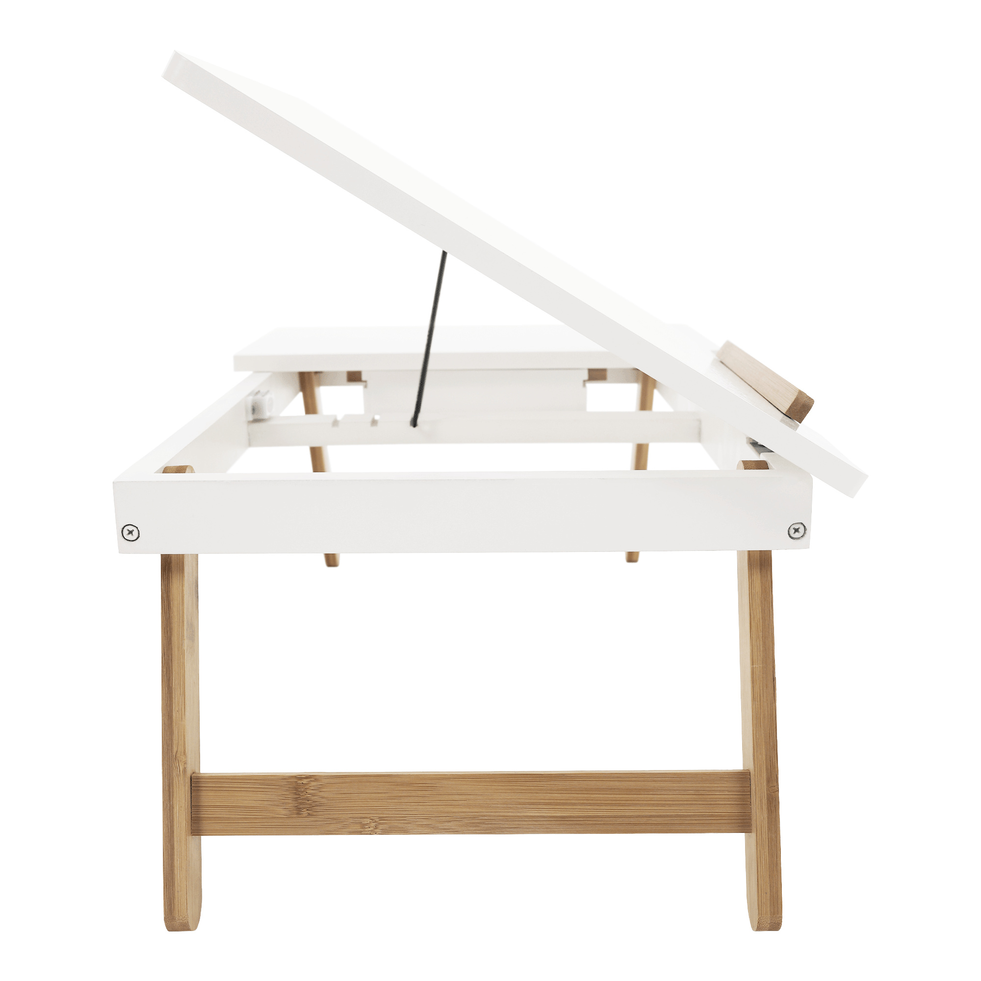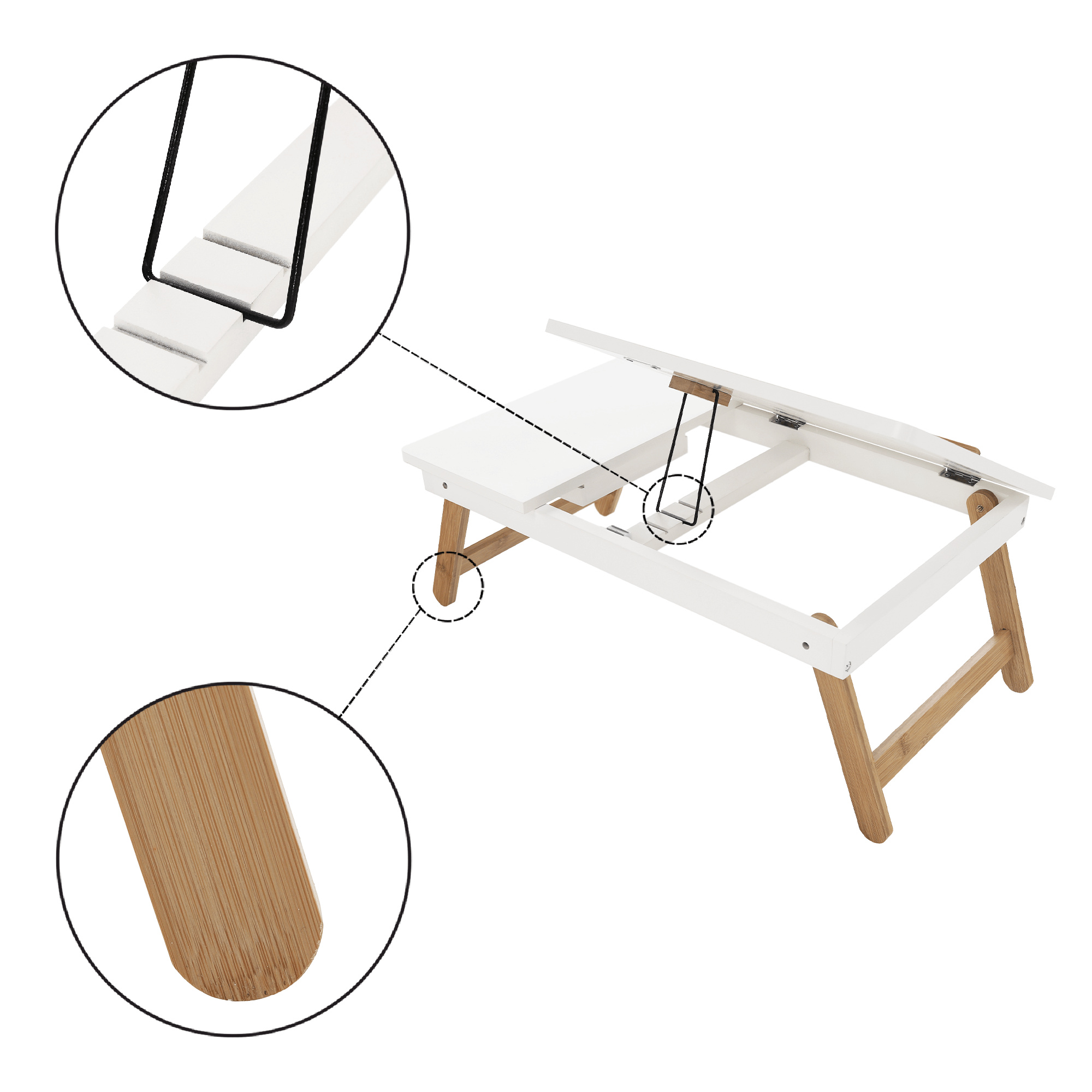 Materiál: MDF/bambus Barva: bílá/přírodní bambus Rozměry (ŠxHxV): 59x34,5x22 cm Výška prostoru od země po polici: 17,5 cm Rozměry přihrádky: 14,5x14,5x3 cm Rozměry vyklápěcí části (ŠxH): 36,5x34,5 cm Tloušťka vyklápěcí desky: 1 cm Nosnost: Max. 10 kg Hmotnost: 3 kg Inovativní a funkční design Stolek na notebook, boční stůl Držák na tablet Vhodný jako podnos Vytahovací přihrádka na drobnosti Možnost nastavení sklonu: 3 polohy Všestranný Sklápěcí nohy Jednoduchá manipulace a přenos Dodáváno v demontu.