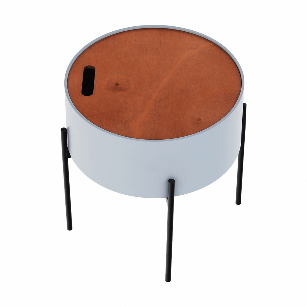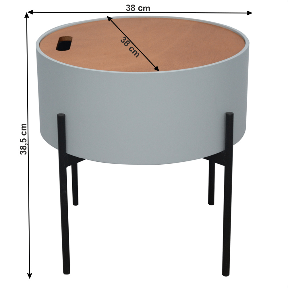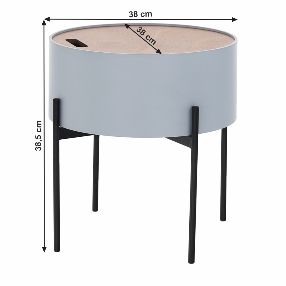 Materiál: MDF / kov Barva: šedá / přírodní / černá Rozměry (ŠxHxV): 38x38x38,5 cm Nosnost: 30 kg odnímatelné víko S úložným prostorem Dodávané v demontu