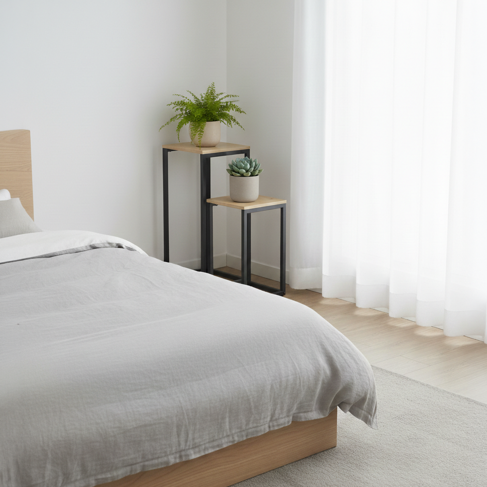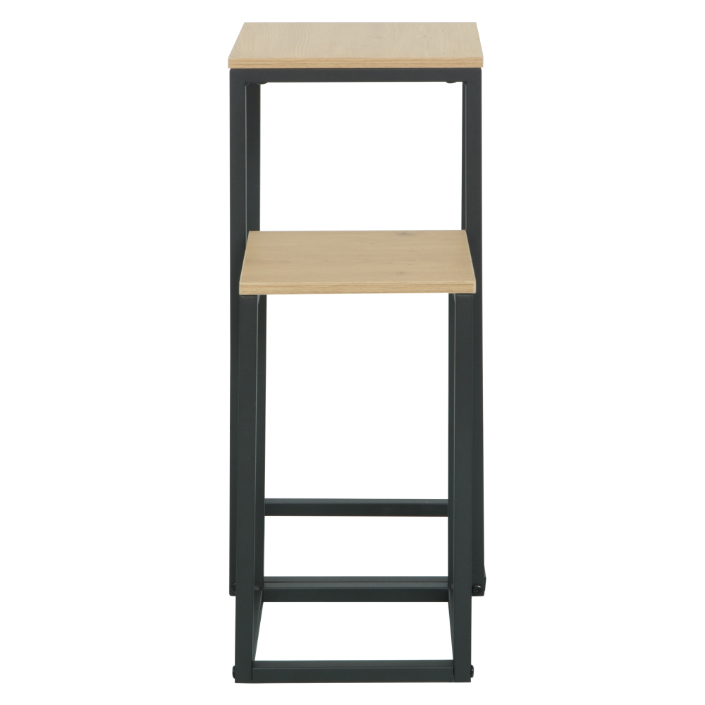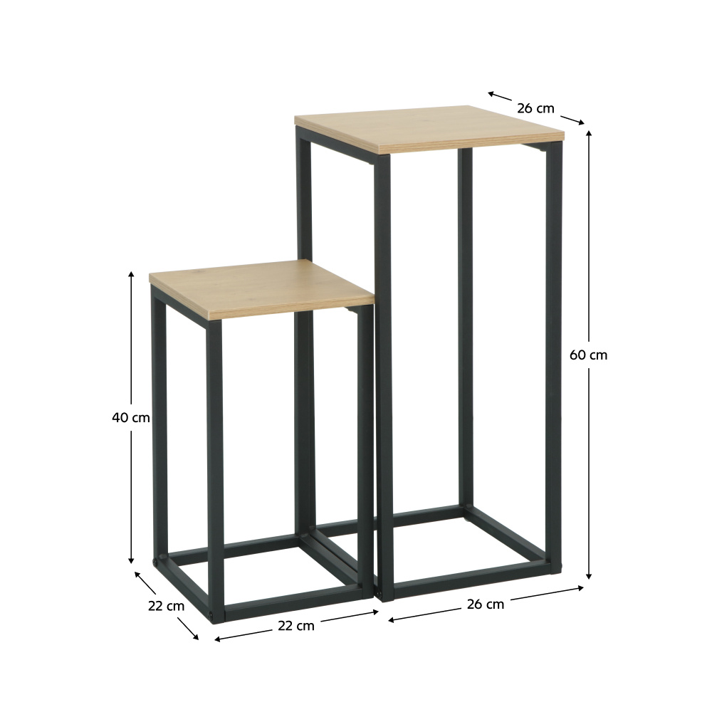 Materiál: melaminová PB deska/kov Barva: dub/černá Rozměry většího stolku (ŠxHxV): 26x26x60 cm Rozměry menšího stolku (ŠxHxV): 22x22x40 cm Tloušťka materiálu PB desky: 1,2 cm Nosnost: 20 kg Set 2 kusů Moderní a stylový Dodáváno v demontu