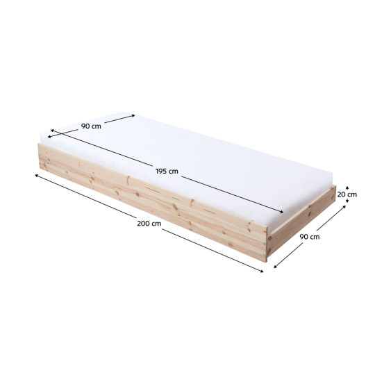 Materiál: smrk Barva: přírodní Rozměry (ŠxHxV): 200x90x20 cm Plocha na spaní (ŠxH): 90x195 cm Tloušťka materiálu: 1,8 cm Nosnost: 100 kg S kolečky Dodávána s laťkovým roštem Počet latí: 15 Dodávána bez matrace Možnost zakoupit matraci z naší nabídky Doporučená výška matrace: 12 cm Možnost zakoupit k posteli BENY nebo palandy BENY Kvalitní slovenský výrobek Dodáváno v demontu