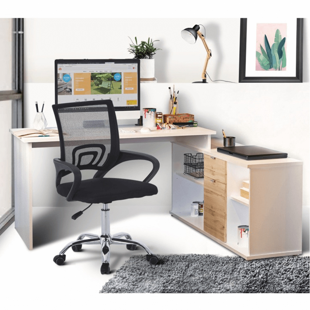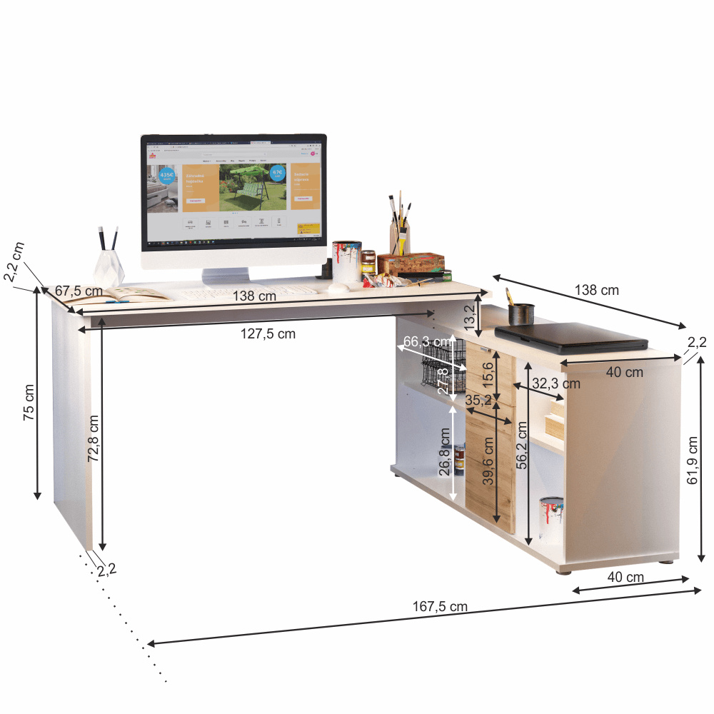 Rohový univerzální PC stůl s policemi a skříňkou se šuplíkem Materiál: DTD laminovaná Barva: bílá / dub Wotan Rozměry stolu (ŠxHxV): 167,5x67,5x75 cm Celkové rozměry (ŠxHxV): 167,5x138x75 cm Rozměry úložného prostoru (ŠxHxV): 138x40x61,5 cm Tloušťka materiálu korpus: 16 mm Tloušťka plátu a nohy stolu: 22 mm Dodávané v demontu