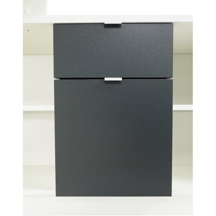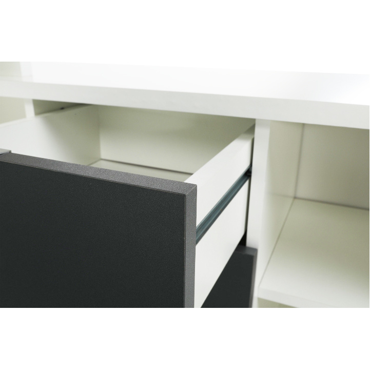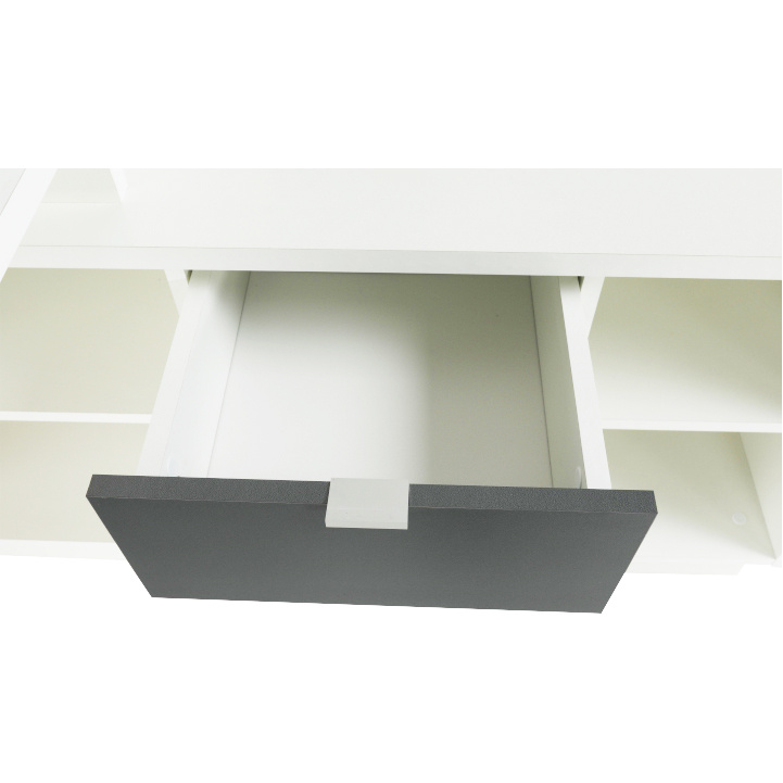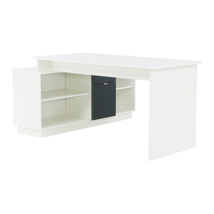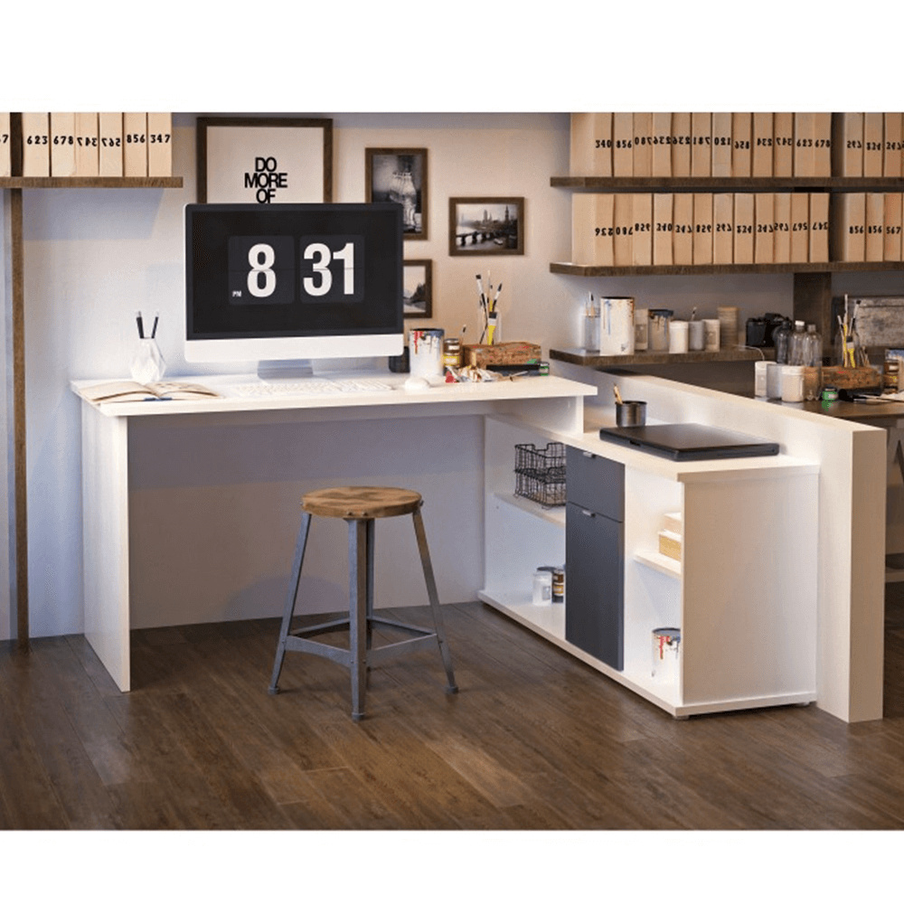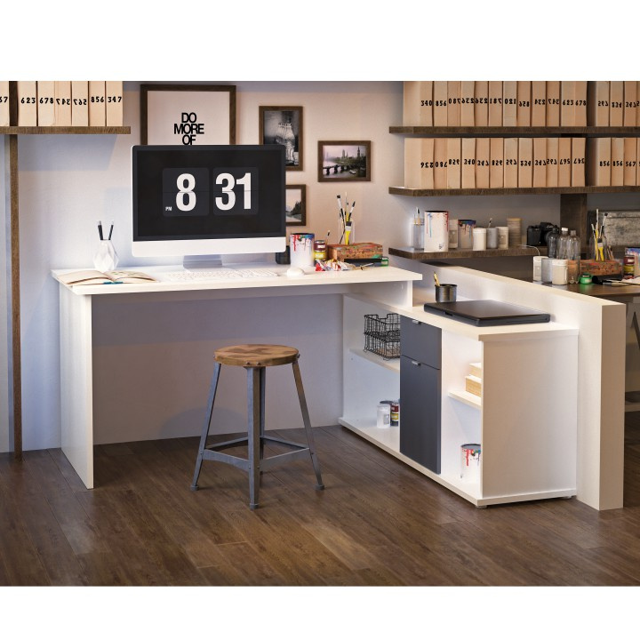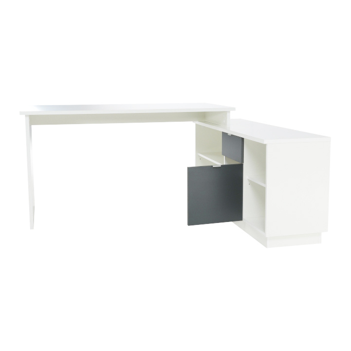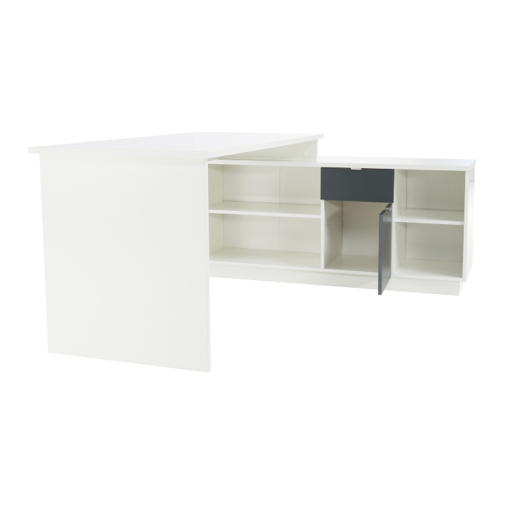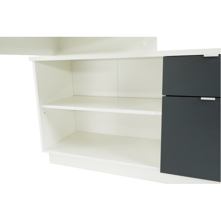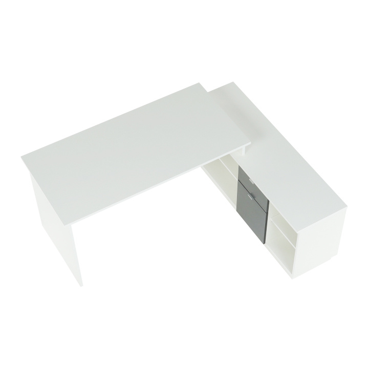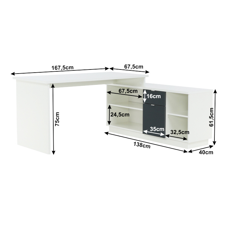 Rohový PC stůl s policemi a skříňkou se šuplíkem Materiál: DTD laminovaná Barva: šedá / bílá Rozměry stolu (ŠxHxV): 167,5x67,5x75 cm Celkové rozměry (ŠxHxV): 167,5x138x75 cm Rozměry úložného prostoru (ŠxHxV): 138x40x61,5 cm Tloušťka materiálu korpus: 16/22 mm