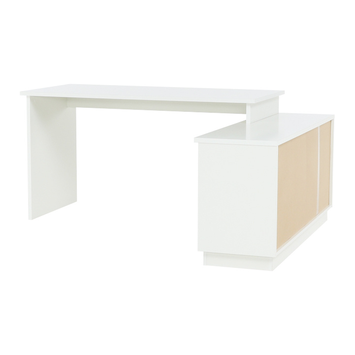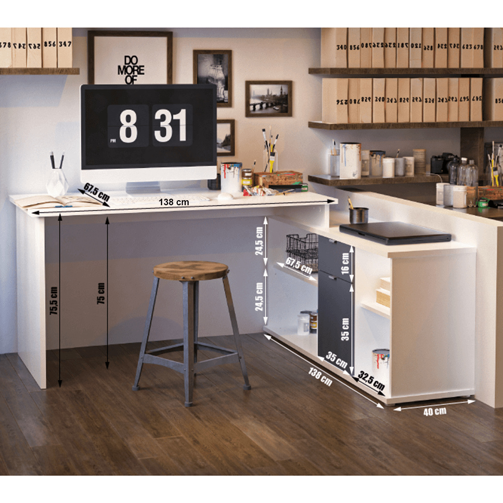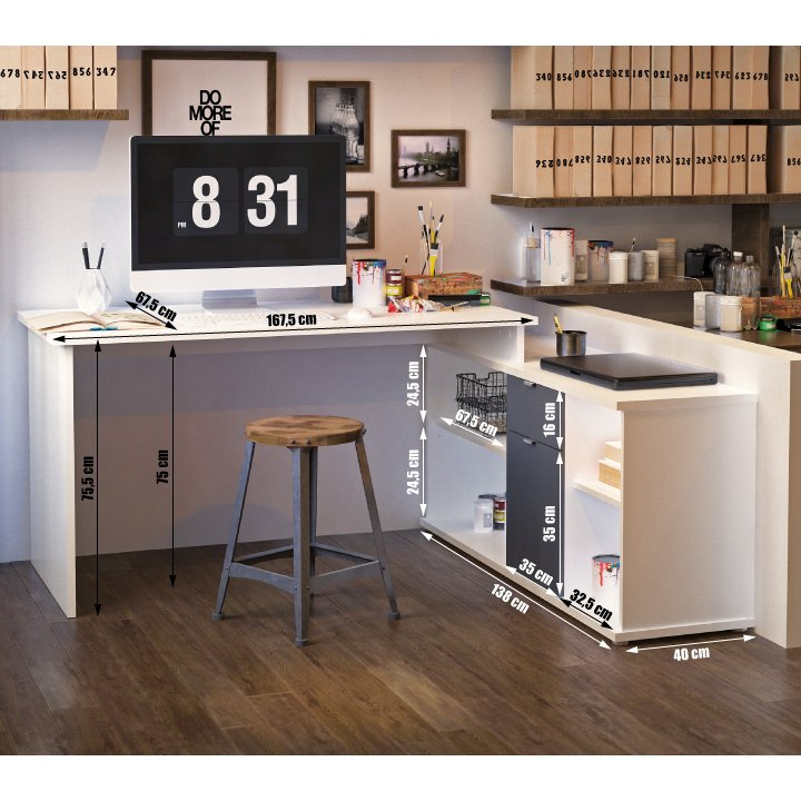 Rohový univerzální PC stůl s policemi a skříňkou se šuplíkem Materiál: DTD laminovaná Barva: bílá / dub Wotan Rozměry stolu (ŠxHxV): 167,5x67,5x75 cm Celkové rozměry (ŠxHxV): 167,5x138x75 cm Rozměry úložného prostoru (ŠxHxV): 138x40x61,5 cm Tloušťka materiálu korpus: 16 mm Tloušťka plátu a nohy stolu: 22 mm Dodávané v demontu Hmotnost: 60