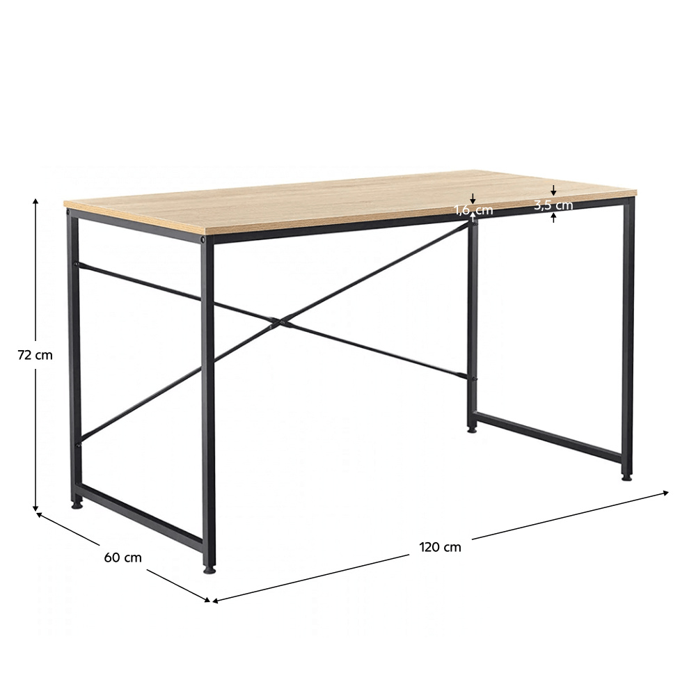 Materiál: MDF laminovaná / kov Barva: buk / černá Rozměry (ŠxHxV): 100x60x72 cm Tloušťka materiálu plátu stolu: 18 mm Tloušťka materiálu police: 15 mm Hloubka police: 17 cm Výška mezi policí a konstrukcí: 38 cm S policí Dodávané v demontu Hmotnost: 17.3kg