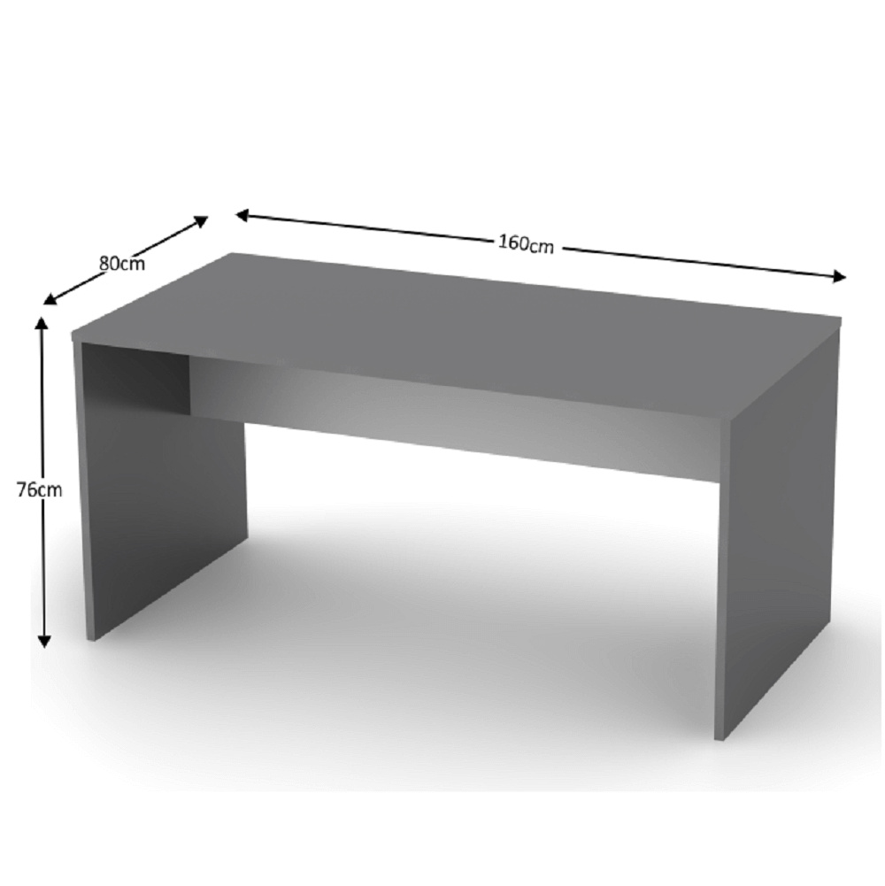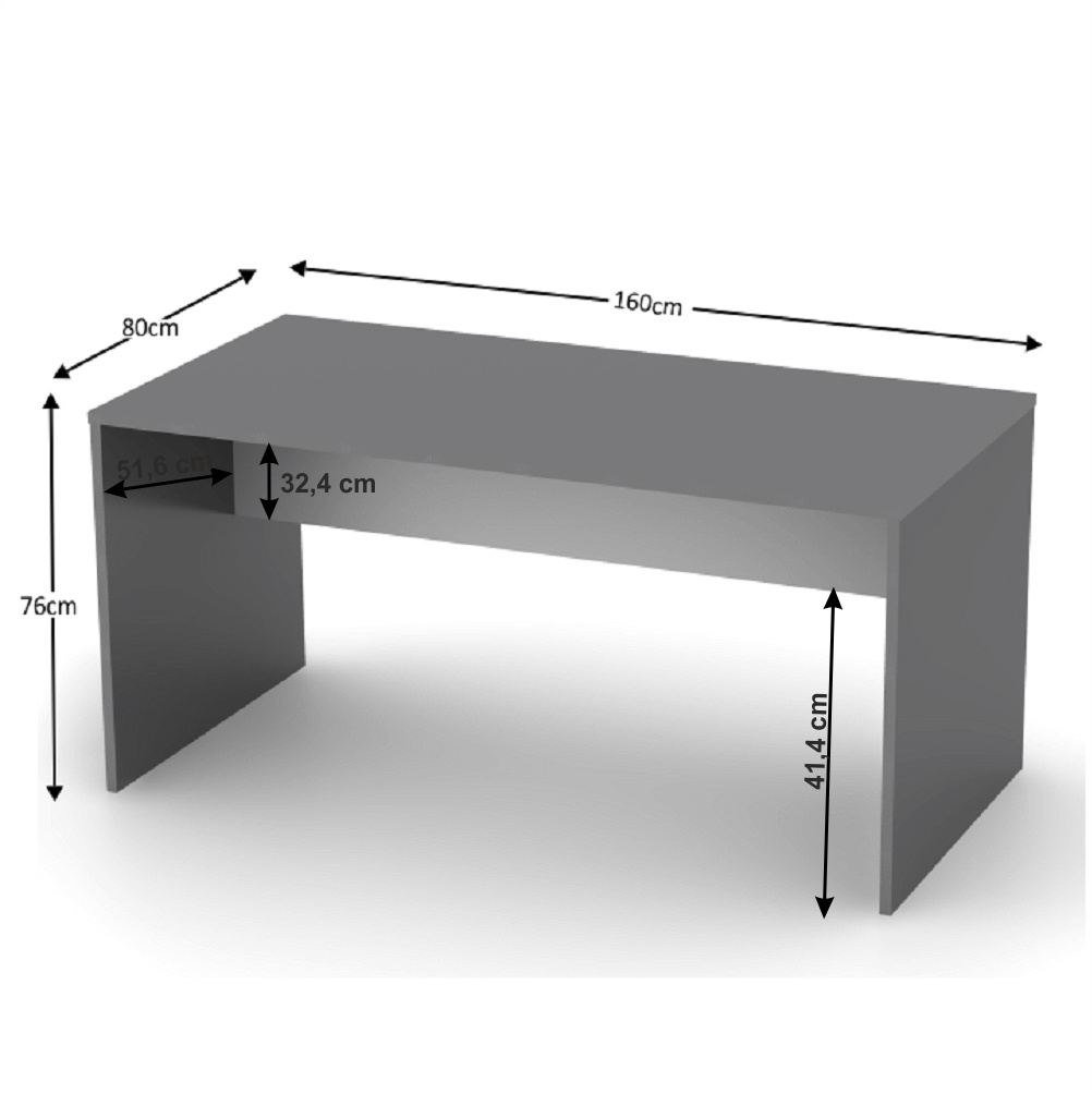 Psací stůl RIOMA NEW TYP 16 Barevné provedení: grafit / bílá Materiál: DTD laminovaná Rozměry (ŠxHxV): 160x80x76 cm Tloušťka materiálu: 16/22 mm Výška desky po stůl: 32,4 cm Výška od podlahy po středovou desku: 41,4 cm Šířka prostoru na židli: 51,6 cm Dodávané v demontu.