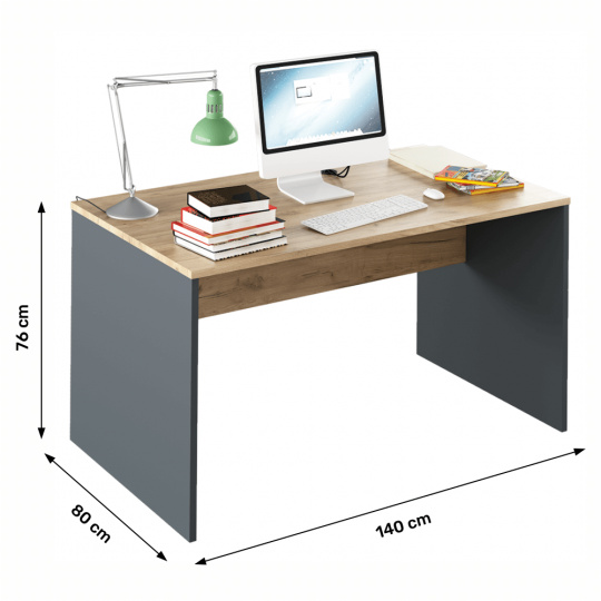 Psací stůl RIOMA NEW TYP 11 Barevné provedení: grafit / dub artisan Materiál: DTD laminovaná Rozměry (ŠxHxV): 140x80x76 cm Tloušťka materiálu: 22 mm Dodávané bez kontejneru, kontejner je možné si dokoupit Dodávané v demontu.