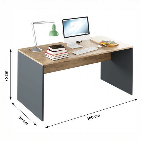 Psací stůl RIOMA NEW TYP 16 Barevné provedení: grafit / dub artisan Materiál: DTD laminovaná Rozměry (ŠxHxV): 160x80x76 cm Tloušťka materiálu: 16/22 mm Výška desky po stůl: 32,4 cm Výška od podlahy po středovou desku: 41,4 cm Šířka prostoru na židli: 51,6 cm Dodávané v demontu.