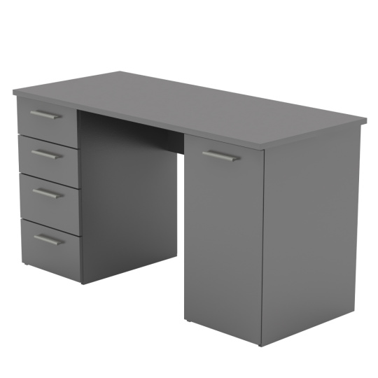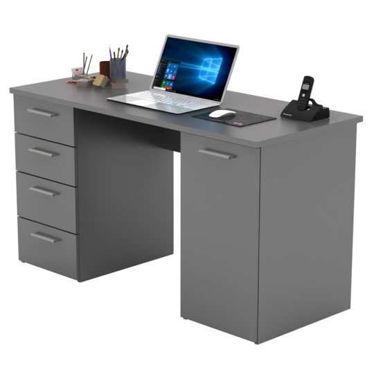 PC stůl EUSTACH Materiál: DTD laminovaná Barva: grafit Tloušťka materiálu: 16/22 mm Rozměry (ŠxHxV): 137x60x76,3 cm Rozměry skříňky (ŠxHxV): 37,8x60x76,3 cm Čtyři šuplíky, jedna skříňka Výška mělčích šuplíků: 16 cm Výška hlubších šuplíků: 19,4 cm Dodáváno v demontu Kvalitní slovenský výrobek