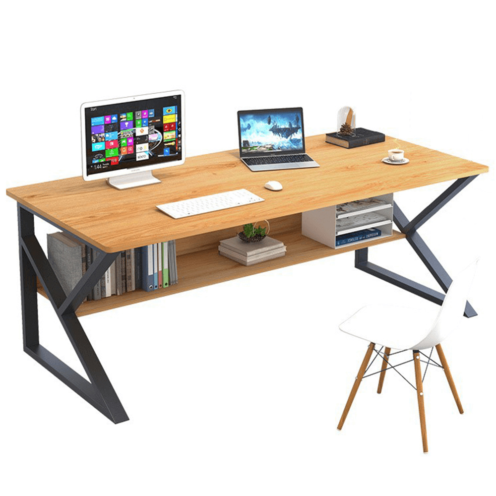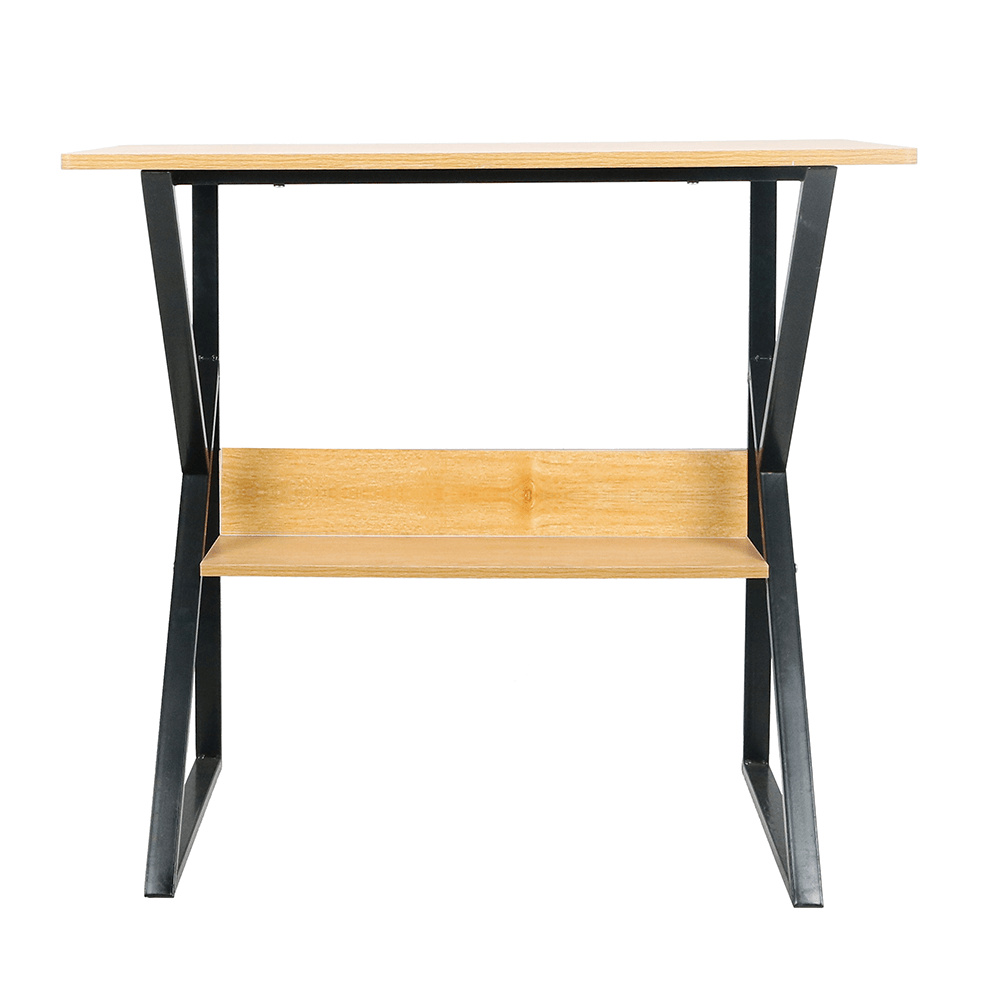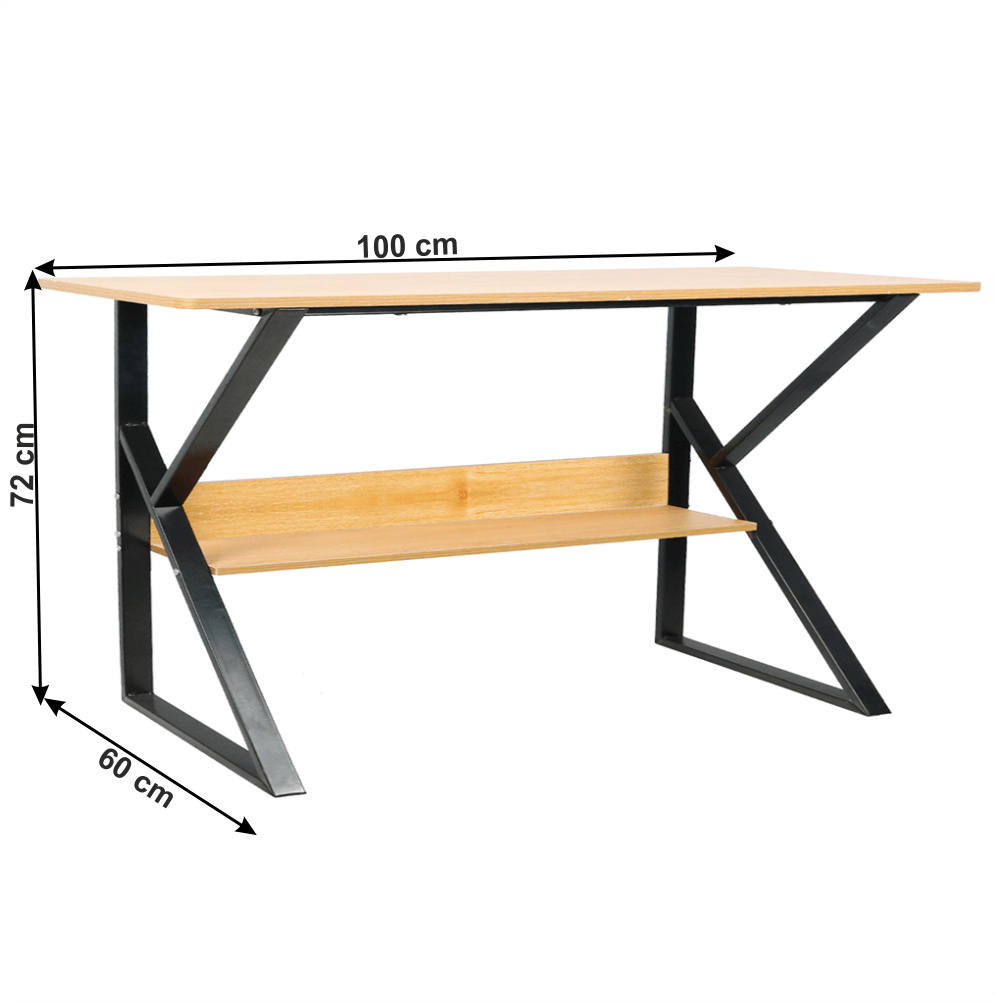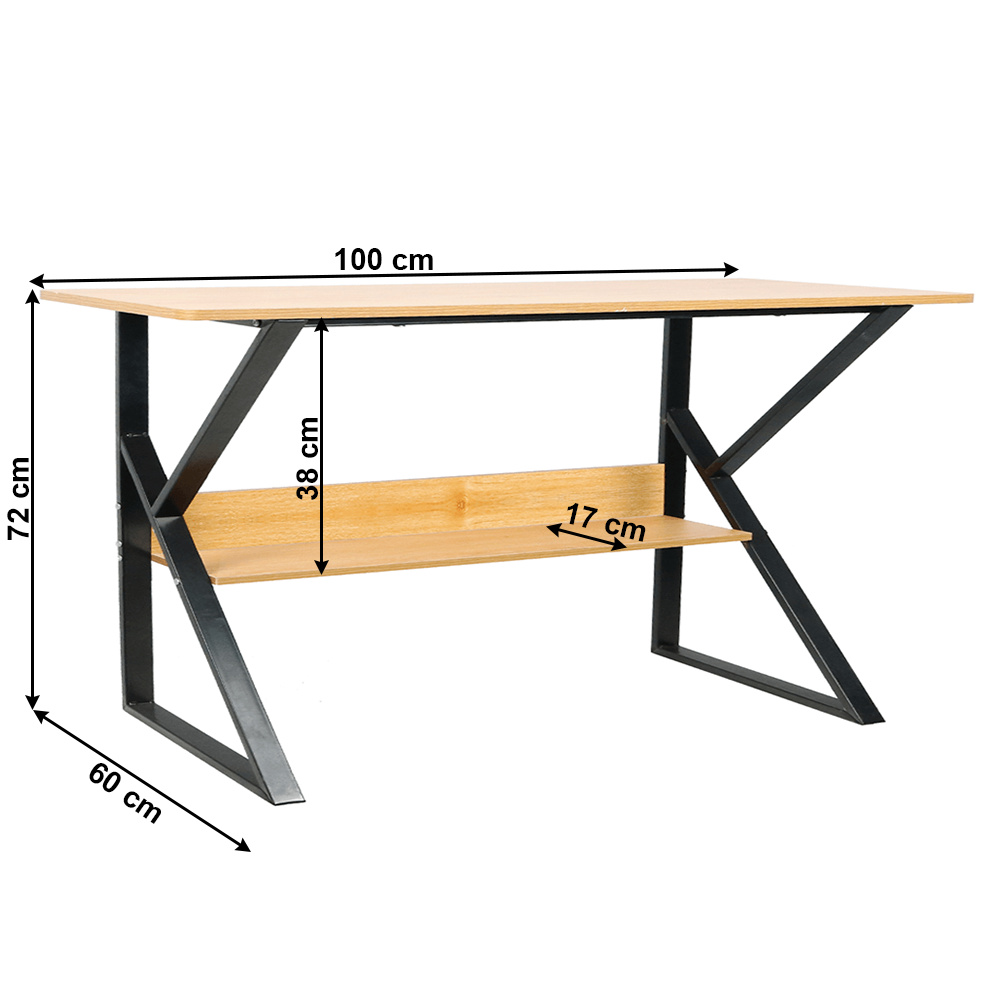 Materiál: MDF laminovaná / kov Barva: buk / černá Rozměry (ŠxHxV): 100x60x72 cm Tloušťka materiálu plátu stolu: 18 mm Tloušťka materiálu police: 15 mm Hloubka police: 17 cm Výška mezi policí a konstrukcí: 38 cm S policí Dodávané v demontu