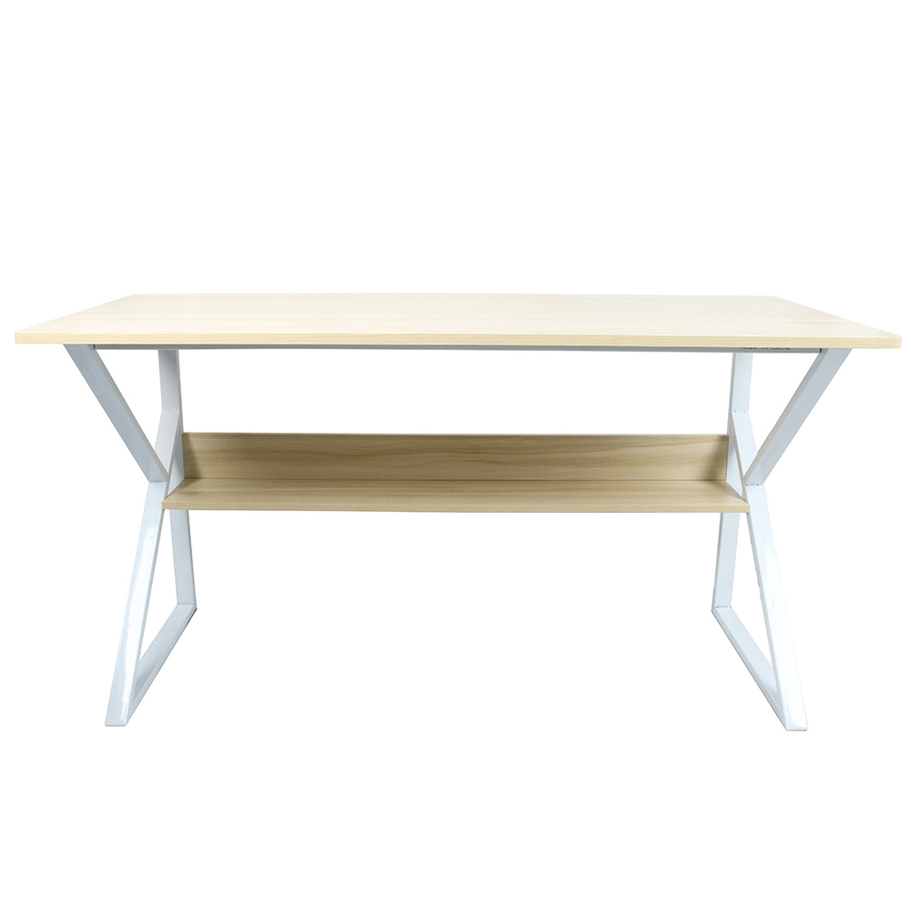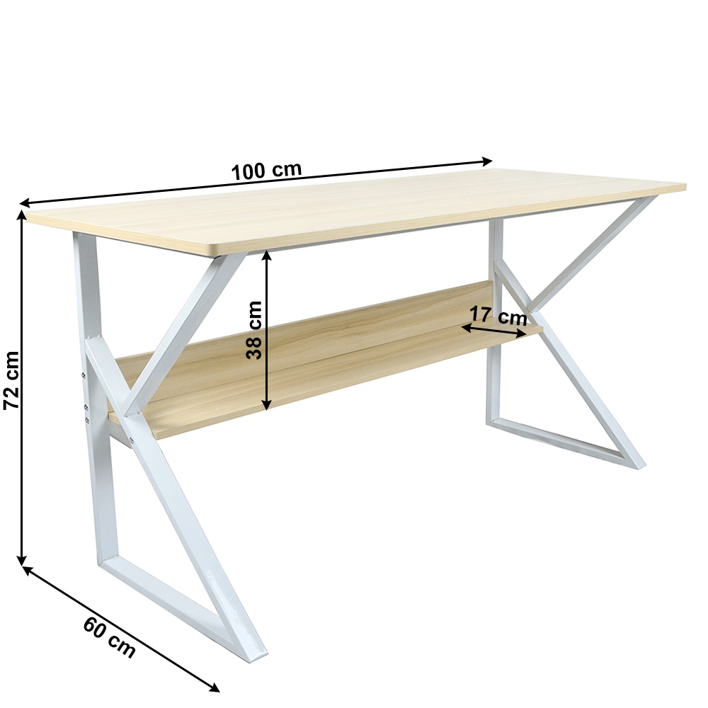 Materiál: MDF laminovaná / kov Barva: dub přírodní / bílá Rozměry (ŠxHxV): 100x60x72 cm Tloušťka materiálu plátu stolu: 18 mm Tloušťka materiálu police: 15 mm Hloubka police: 17 cm Výška mezi policí a konstrukcí: 38 cm S policí Dodávané v demontu