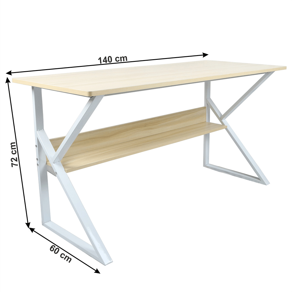 Materiál: MDF laminovaná / kov Barva: dub přírodní / bílá Rozměry (ŠxHxV): 140x60x72 cm Tloušťka materiálu plátu stolu: 18 mm Tloušťka materiálu police: 15 mm Hloubka police: 17 cm Výška mezi policí a konstrukcí: 38 cm S policí Dodávané v demontu