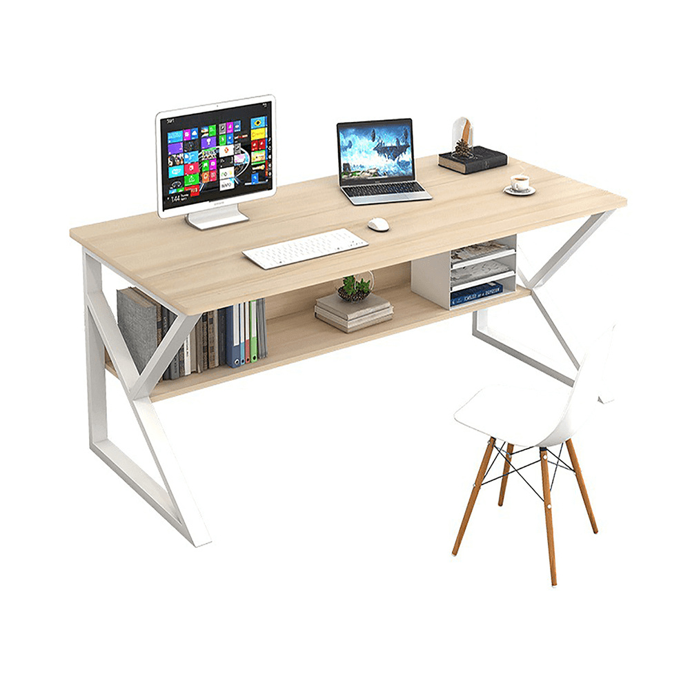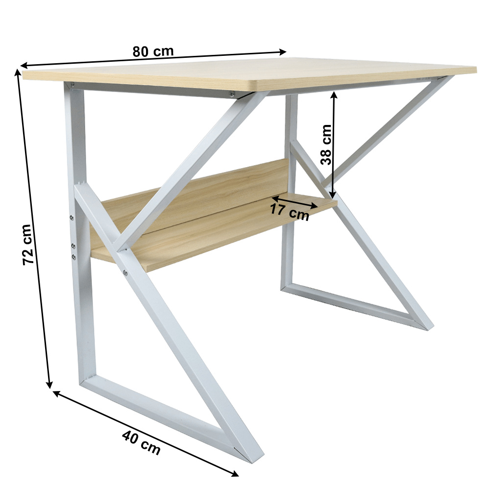 Materiál: MDF laminovaná / kov Barva: dub přírodní / bílá Rozměry (ŠxHxV): 80x40x72 cm Tloušťka materiálu plátu stolu: 18 mm Tloušťka materiálu police: 15 mm Hloubka police: 17 cm Výška mezi policí a konstrukcí: 38 cm S policí Dodávané v demontu