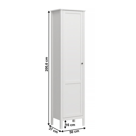 Materiál: DTD laminovaná/ABS hrany/MDF Barva: bílá Rozměry (ŠxHxV): 50x37x200,6 cm Tloušťka materiálu: 1,6 cm Výška nožiček: 16 cm Jednodveřový Policový MDF dvířka Dodávána v demontu