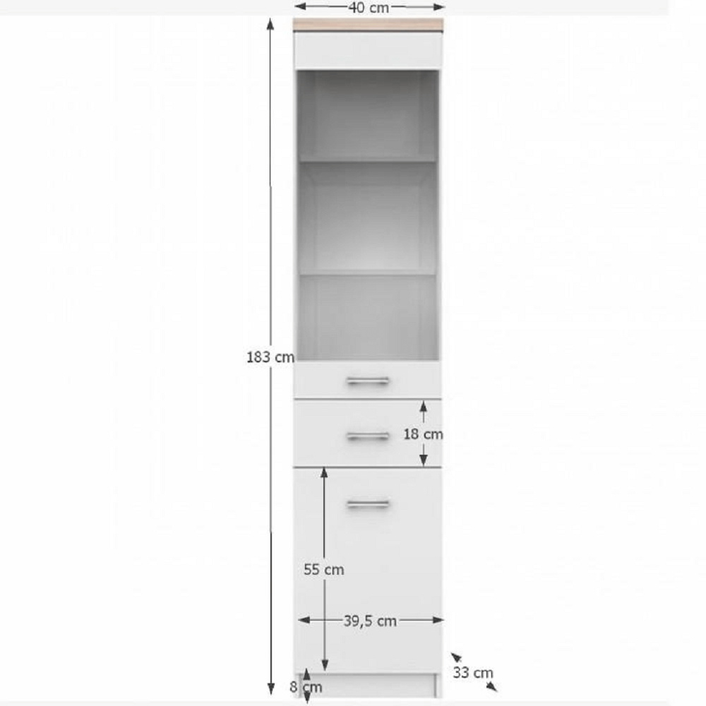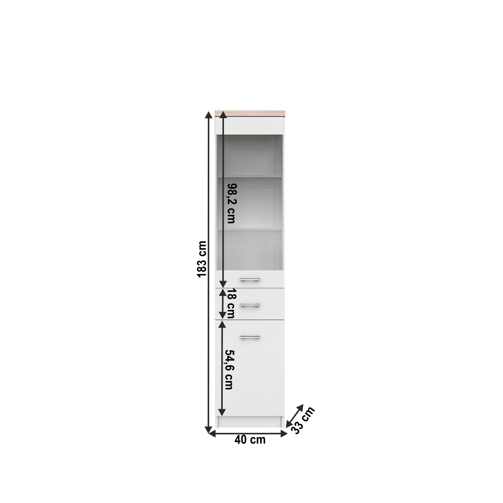 Vitrína 1D1W1S TOPT TYP 03 Materiál: DTD laminovaná Provedení: bílá / dub sonoma Rozměry (ŠxHxV): 40x33x183 cm Tloušťka materiálu korpus: 16 mm Tloušťka materiálu vrchní desky: 32 mm Univerzální Dodávané v demontu.