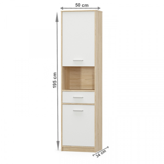 Regál 2D1S TEYO Materiál: DTD laminovaná Barva: bílá / dub sonoma Rozměry (ŠxHxV): 50,2x34,3x195,5 cm Tloušťka materiálu: 16 mm Univerzální dvířka Dodávané v demontu.
