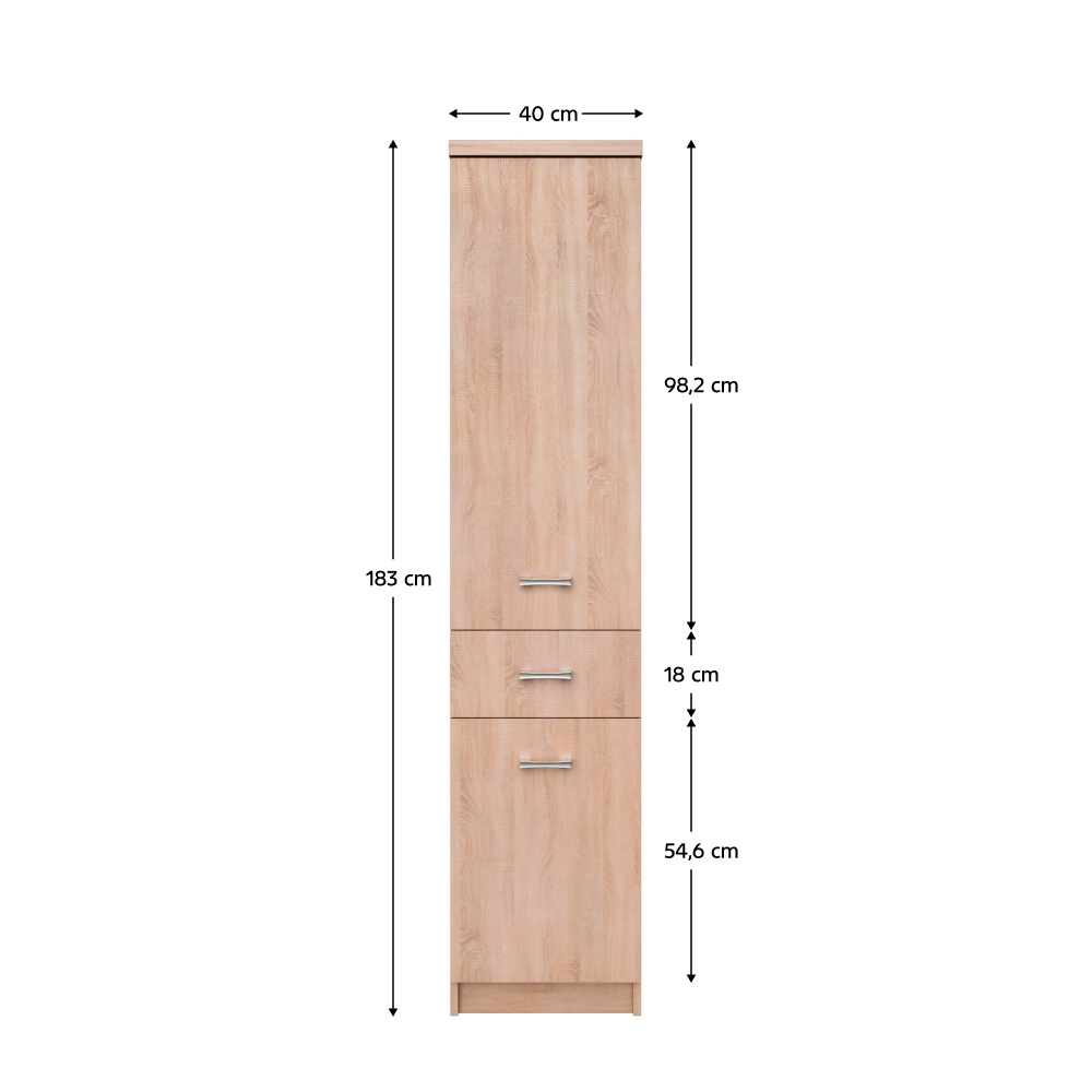 Regál 2D1S TOPTY TYP 31 Materiál: DTD laminovaná Barva: dub sonoma Rozměry (ŠxHxV): 40x33x183 cm Dvoudveřový Poličkový Šuplík Univerzální Úložný prostor Dodáváno v demontu.