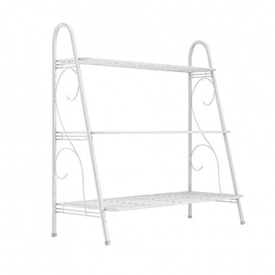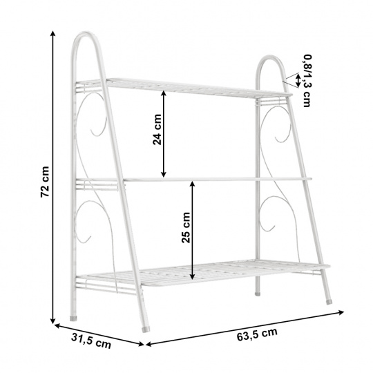 Materiál: kov Barva: bílá Rozměry (ŠxHxV): 63,5x31,5x72 cm Nosnost na polici: 10 kg Tloušťka kovové konstrukce: 0,8-1,3 cm Tři otevřené police elegantní provedení Vhodný do interiéru Všestranně využitelný regál Dodávané v demontu