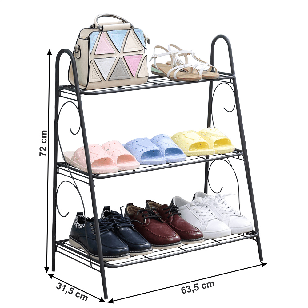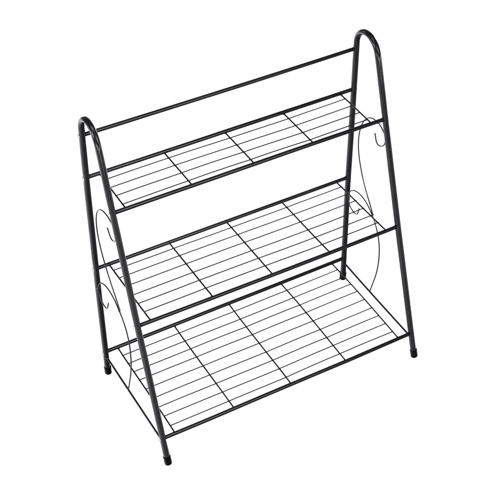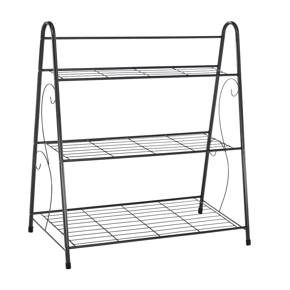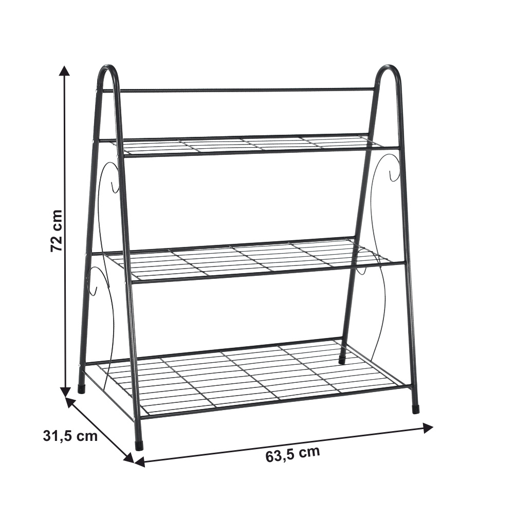 Materiál: kov Barva: tmavě šedá Rozměry (ŠxHxV): 63,5x31,5x72 cm 3 police Po stranách ornamenty Nosnost: 30 kg Nosnost na jednu polici: 10 kg Vhodný do interiéru Dodávané v demontu
