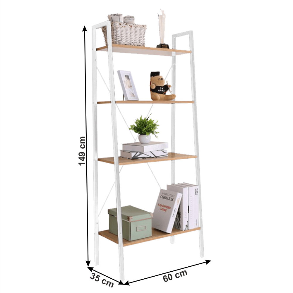 Materiál konstrukce: kov Barva konstrukce: bílá Materiál police: MDF laminovaná Barva police: dub Rozměry (ŠxHxV): 60x35x149 cm Čtyři poličky Rozměry první police (HxV): 33,5x43 cm Rozměry druhé police (HxV): 29x33 cm Rozměry třetí police (HxV): 25,5x33 cm Rozměry čtvrté police (ŠxH): 55,7x21,5 cm Nosnost na jednu polici: 50 kg Tloušťka materiálu: 16 mm Industriální design Všestranný, různé využití Rektifikační šrouby na nohou Dodáváno v demontu