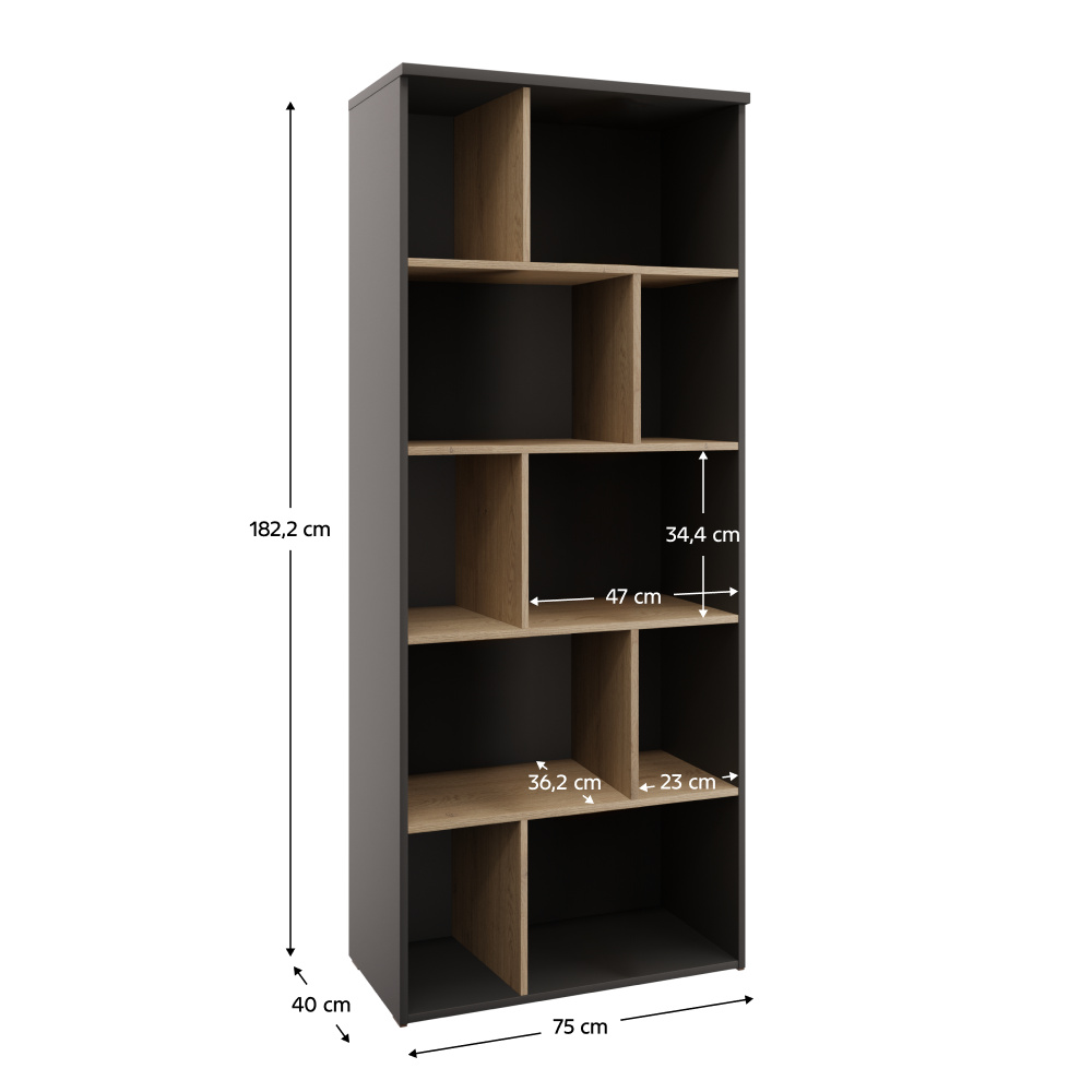 Materiál: DTD laminovaná/ABS hrany Barva: antracit/dub cremona Rozměry (ŠxHxV): 75x40x182,2 cm Tloušťka materiálu: 1,6-2,2 cm Policový Otevřený Plastové kluzáky Výška plastových kluzáků: 0,5 cm Doporučujeme připevnit ke zdi Dodáváno v demontu