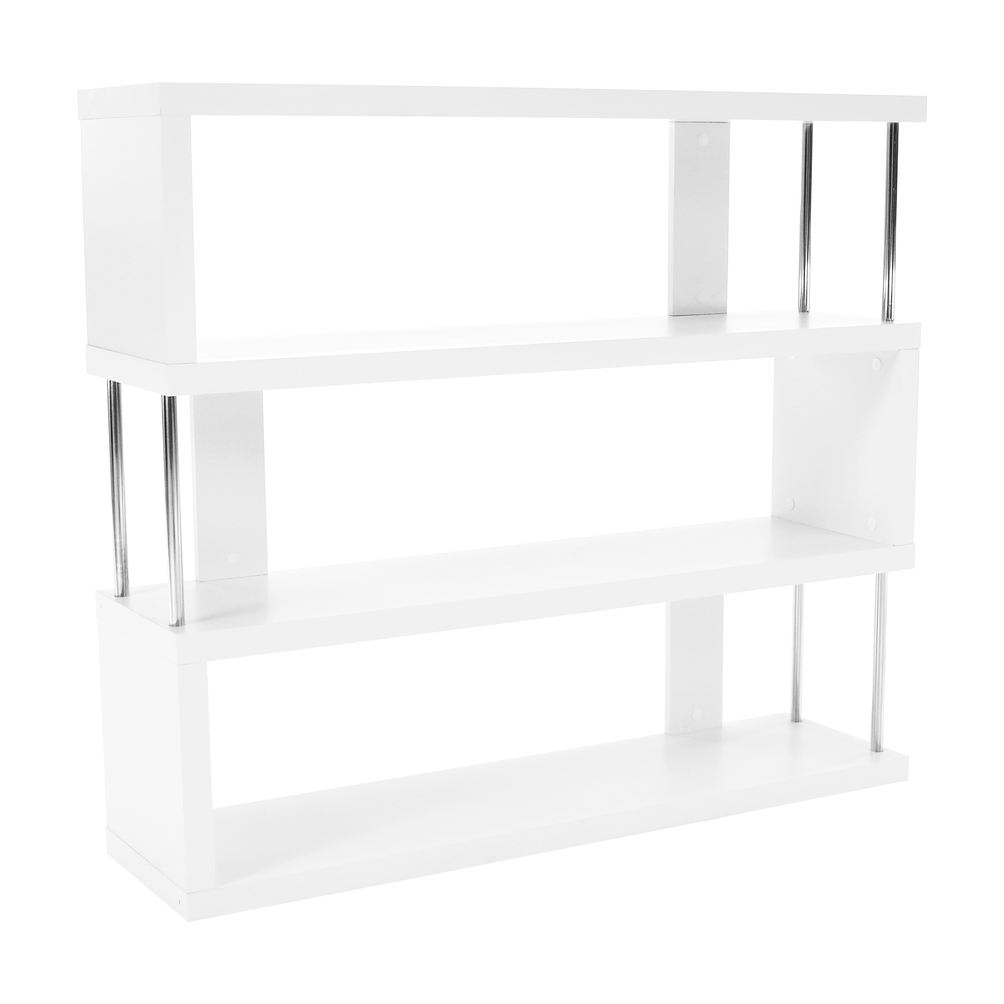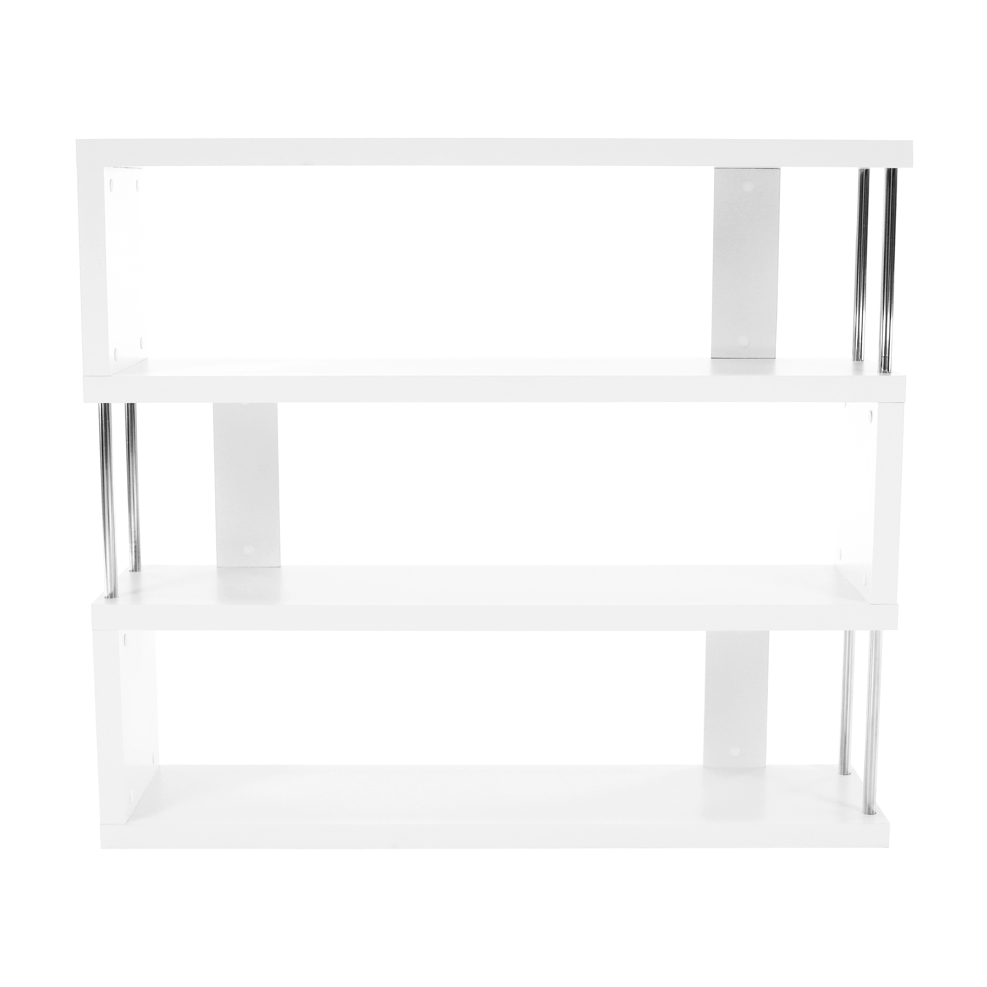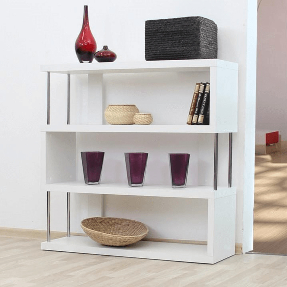 Víceúčelový regál BENITO Materiál: DTD laminovaná / chrom Barva: bílá/jemný lesk (ŠxHxV) 110x29x97 cm. Tloušťka korpusu: 36 mm Nosnost na polici: 10 kg Dodávané v demontu.