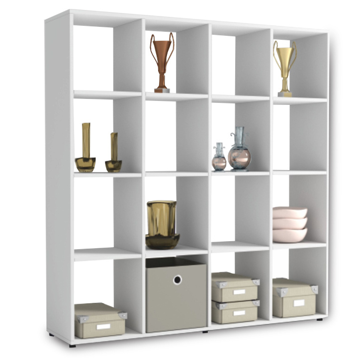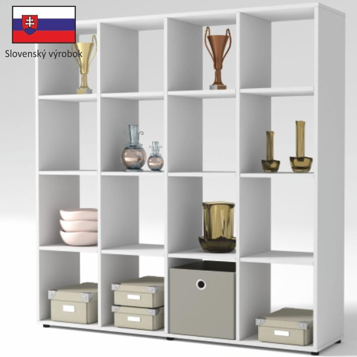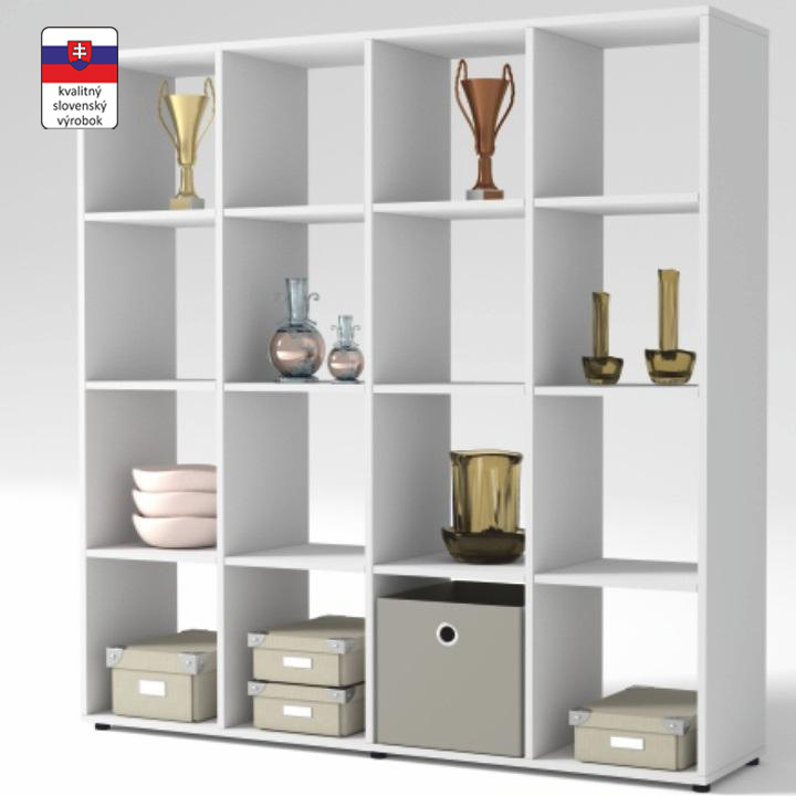 Regál kostka SARAH Materiál: DTD laminovaná Barva: bílá Rozměry (ŠxHxV): 139x33x144 cm Tloušťka materiálu: 16 mm Nosnost police: 5 kg Slovenský výrobek. Dodávané v demontu.