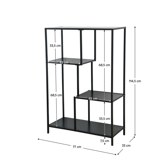 Materiál: kov Barva: černá Rozměry (ŠxHxV): 77x33x114,5 cm Výška nožiček: 7,5 cm Nosnost na jednu polici: 5 kg Otevřený úložný prostor Čtyři odkládací plochy Kovová konstrukce Doporučujeme připevnit ke zdi Dodáváno v demontu