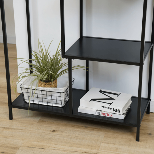 Materiál: kov Barva: černá Rozměry (ŠxHxV): 77x33x185 cm Výška nožiček: 8,5 cm Nosnost na jednu polici: 8 kg Otevřený úložný prostor Šest odkládacích ploch Kovová konstrukce Doporučujeme připevnit ke zdi Dodáváno v demontu